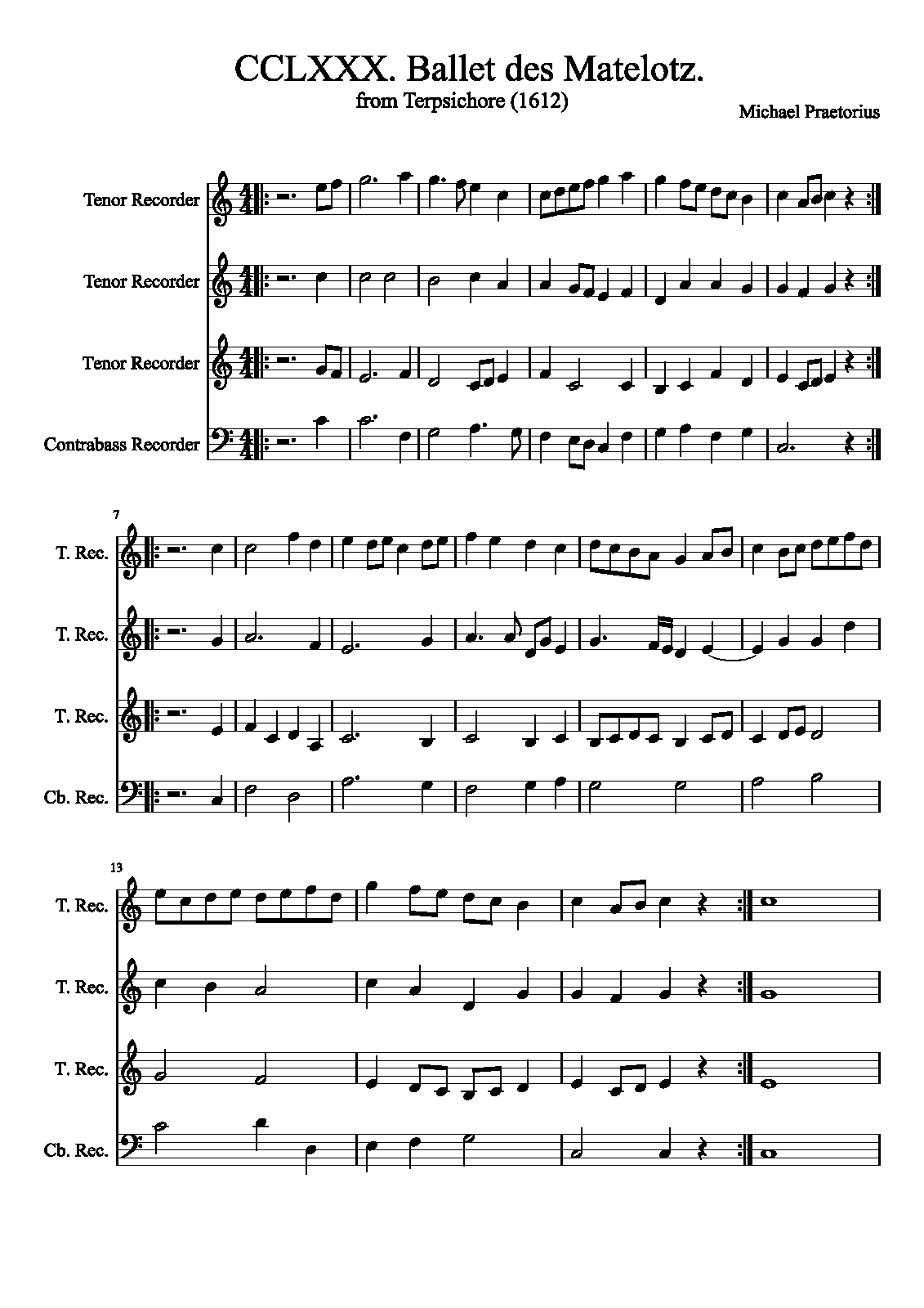 | Extra Information | These pieces were assembled and arranged by Praetorius for his 1612 collection. It is unknown how many, or if any, of the works in the collection were actually composed by Praetorius as opposed to being popular dance tunes arranged by him. The instrumentation is not specified in the original, and simply listed as "à 4". |