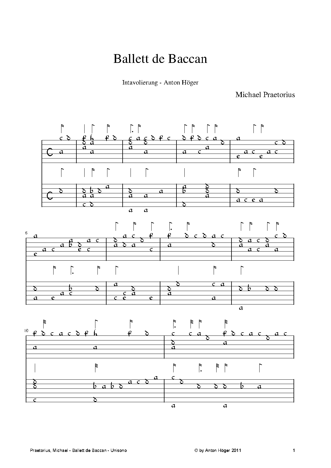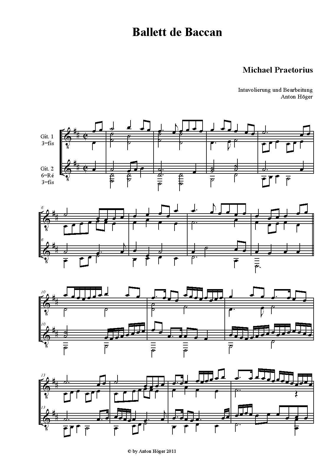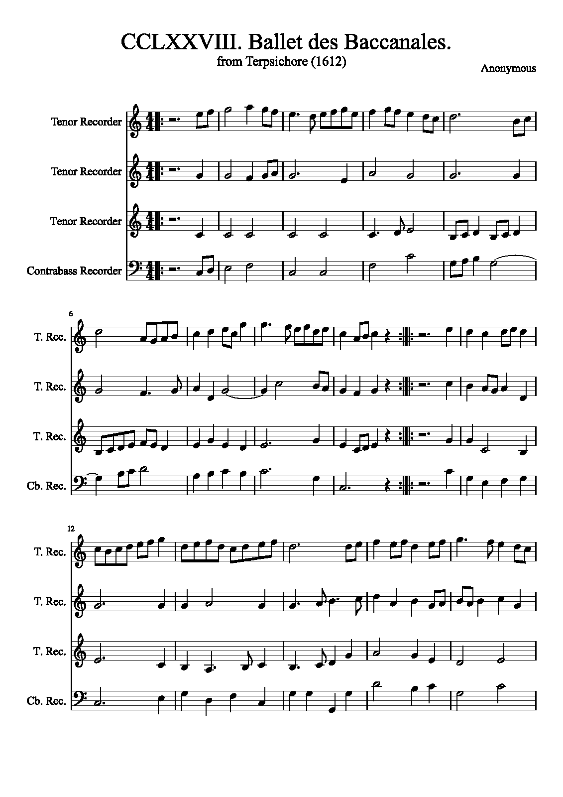 | Extra Information | These pieces were assembled and arranged by Praetorius for his 1612 collection. It is unknown how many, or if any, of the works in the collection were actually composed by Praetorius as opposed to being popular dance tunes arranged by him. The instrumentation is not specified in the original, and simply listed as "à 4". |