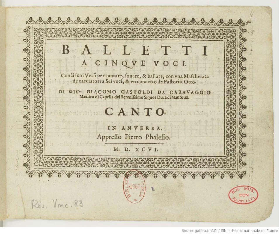 | Alternative. Title | Balletti a cinque voci con li suoi versi per cantare, sonare e ballare con una mascherata de cacciatori a sei voci e un concerto de pastori a otto |