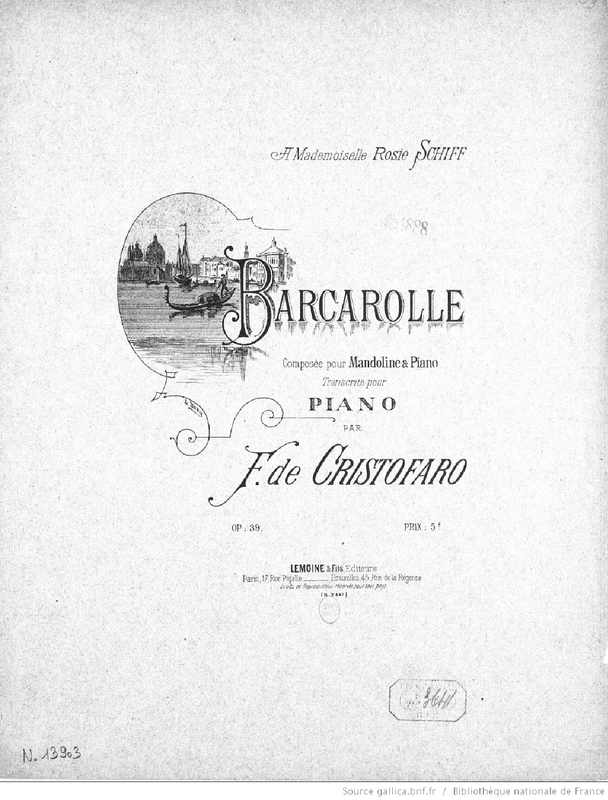 | Genre Categories | Barcarolles; For mandolin, piano; Scores featuring the mandolin; |