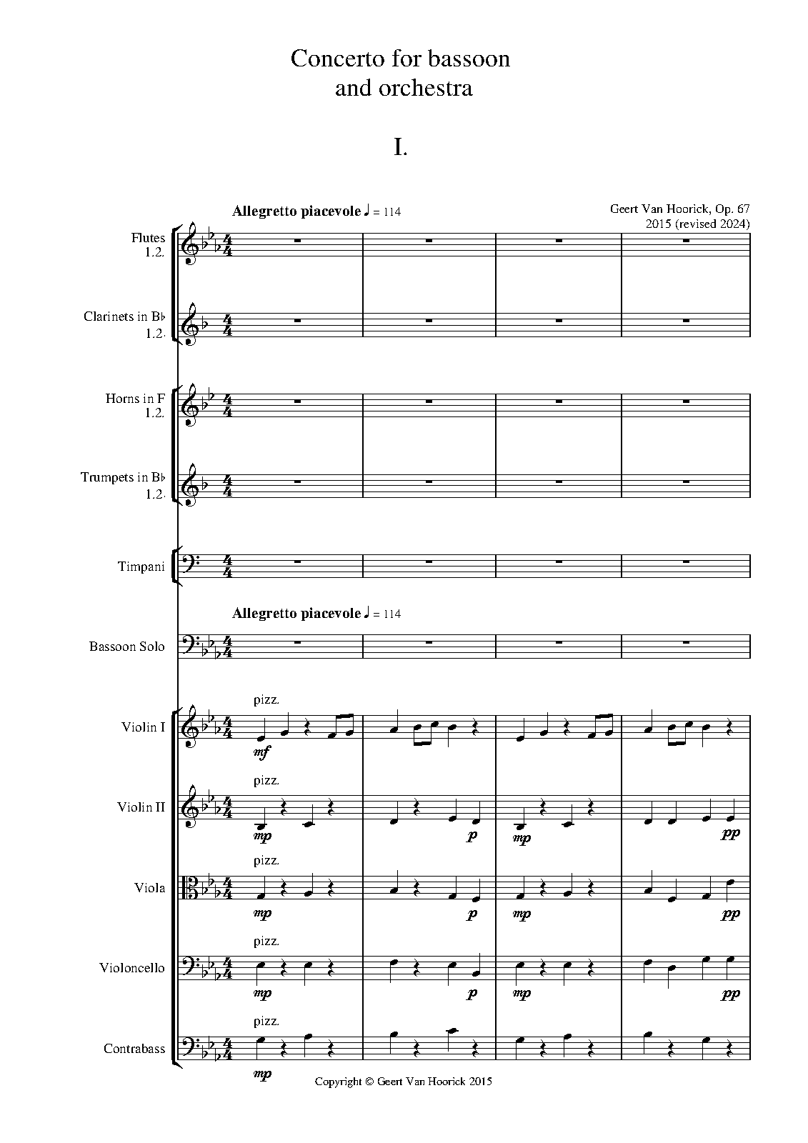 This is a neo-classical bassoon concerto, not too demanding but with enough possibilities for the soloist to show off. It was composed in 2015 and revised in 2024. The 1st movement is gracious and moderately fast and in sonata form; the movement contains a lyrical cadenza. The 2nd movement is a slow and moving cantilene, with a solemn and dramatic middle section, all built upon one theme. The final movement is a very up-tempo galop in rondo form. Digital performance based on a recording using Sibelius 6 and Garritan Personal Orchestra. The parts are not yet updated. On 28th July 2018 The Opus Project Orchestra, with Tim Machajewski as soloist, publicly performed the 1st movement at the Diablo Valley College, in Pleasant Hill, CA , in the USA.