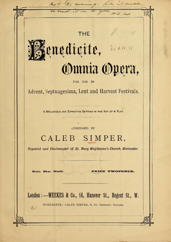| Alternative. Title | Benedicite, Omnia Opera, for use in Advent, Septuagesima, Lent and Harvest Festivals. A melodious and effective setting in the key of A flat. O all ye works of the Lord |
