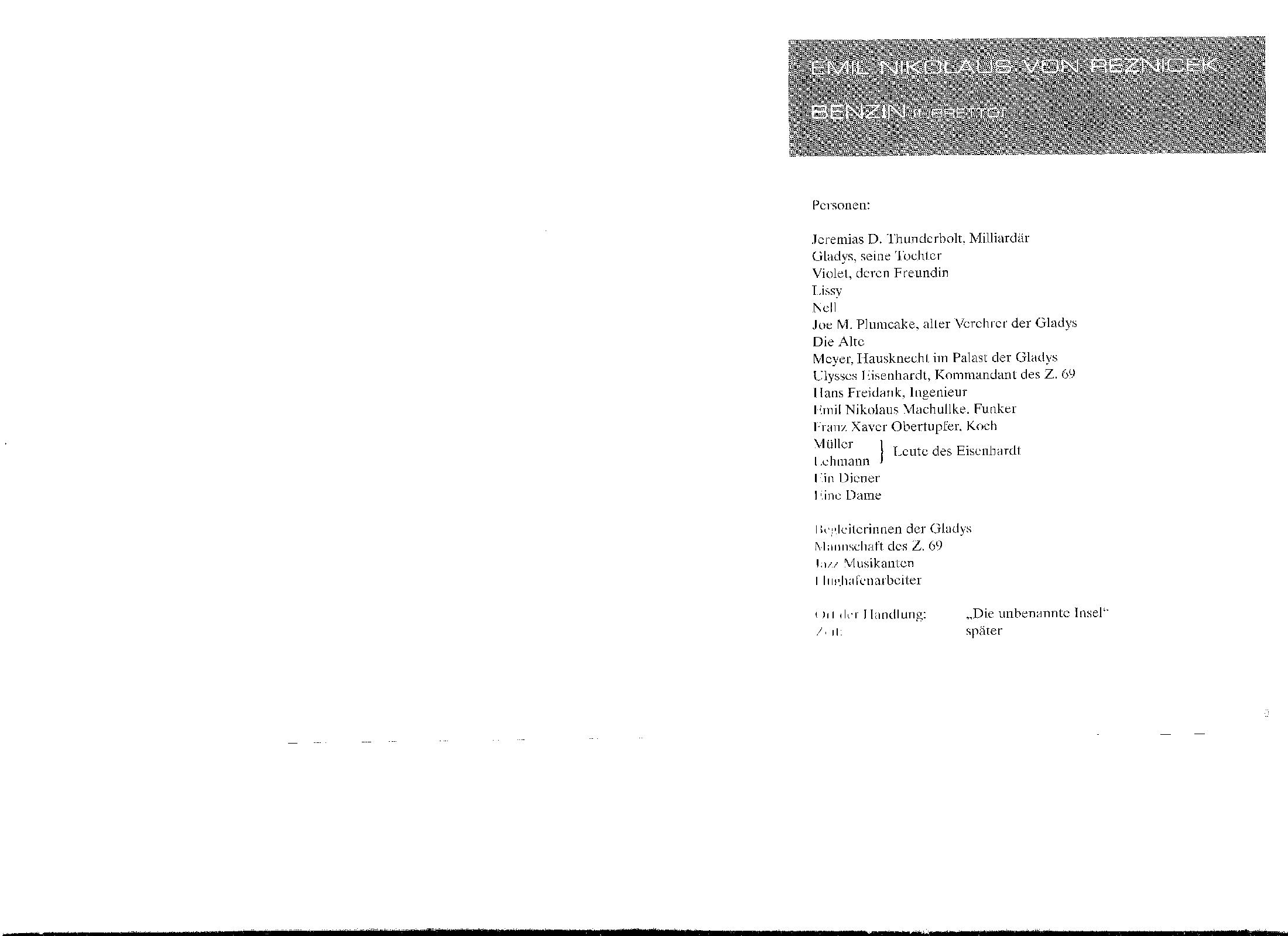 | Alternative. Title | Benzin - Heiter-Phantastisches Spiel mit Musik in zwei Akten frei nach Pietro Calderon de la Barca |