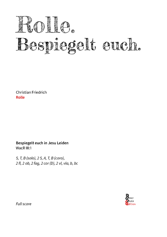 | Alternative. Title | Passions-Oratorium nach dem Evangelisten Bespiegelt euch in Jesu ÎÆ von J. H. (recte: C. F.) Rolle. |