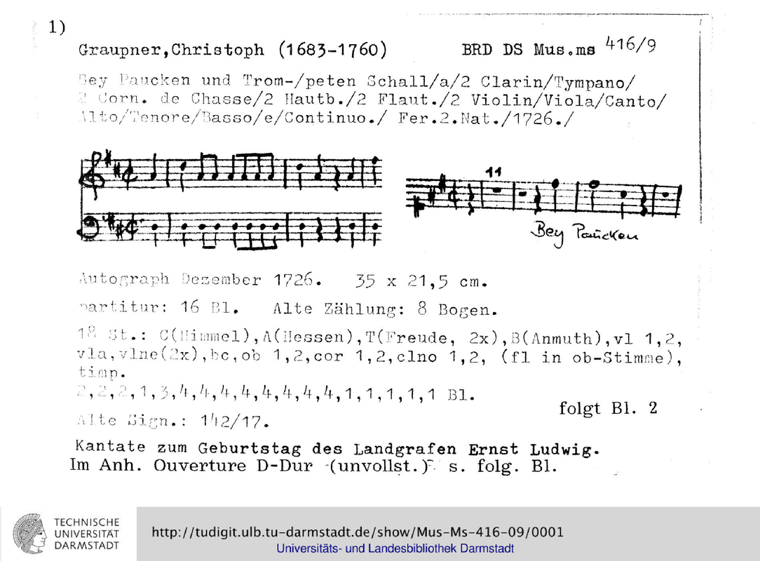 | Alternative. Title | Kantate zum Geburtstag des Landgrafen Ernst Ludwig |