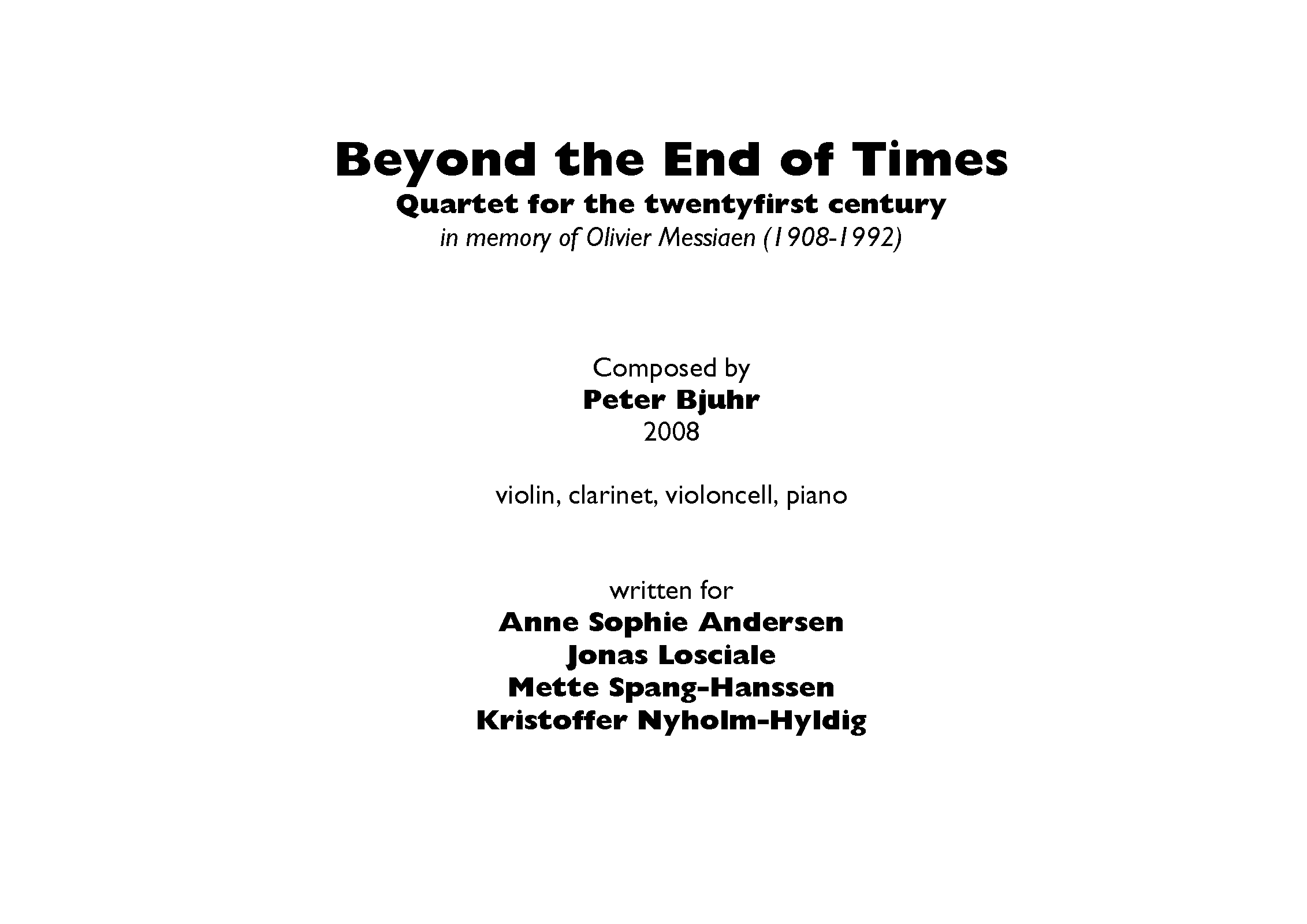 This piece is basically formed by three different sections (or themes): The first section (the techonological theme) is not build upon Messiaen´s quartet as much as on Messiaen in general. It uses scales from his "modes of limited transposition". The strings uses a whole-tone scale, the piano a dim-scale and the clarinet a scale which is Messiaens own. This section also features (pizzicato) harmonics in the strings. The second section (the powerlessness theme) has more direct references to Messiaen´s quartet. It uses the typical 16ths pulse chords in the piano and also utilizes some very short fragmented quotations. The third section (the humanity theme) has in contrast much less references to Messiaen. It tries to capture the feeling of despair and hopelessness we can feel today. It constitutes of a Dm11(b13) chord held over several bars. After the basic material is presented the themes are rearranged and varied throughout. The last time the humanity theme is heard it has been transformed into something more hopeful, yet the cello is presenting a threatening figure. The piece ends as it begins with the technological theme leaving the future still in obscurity.