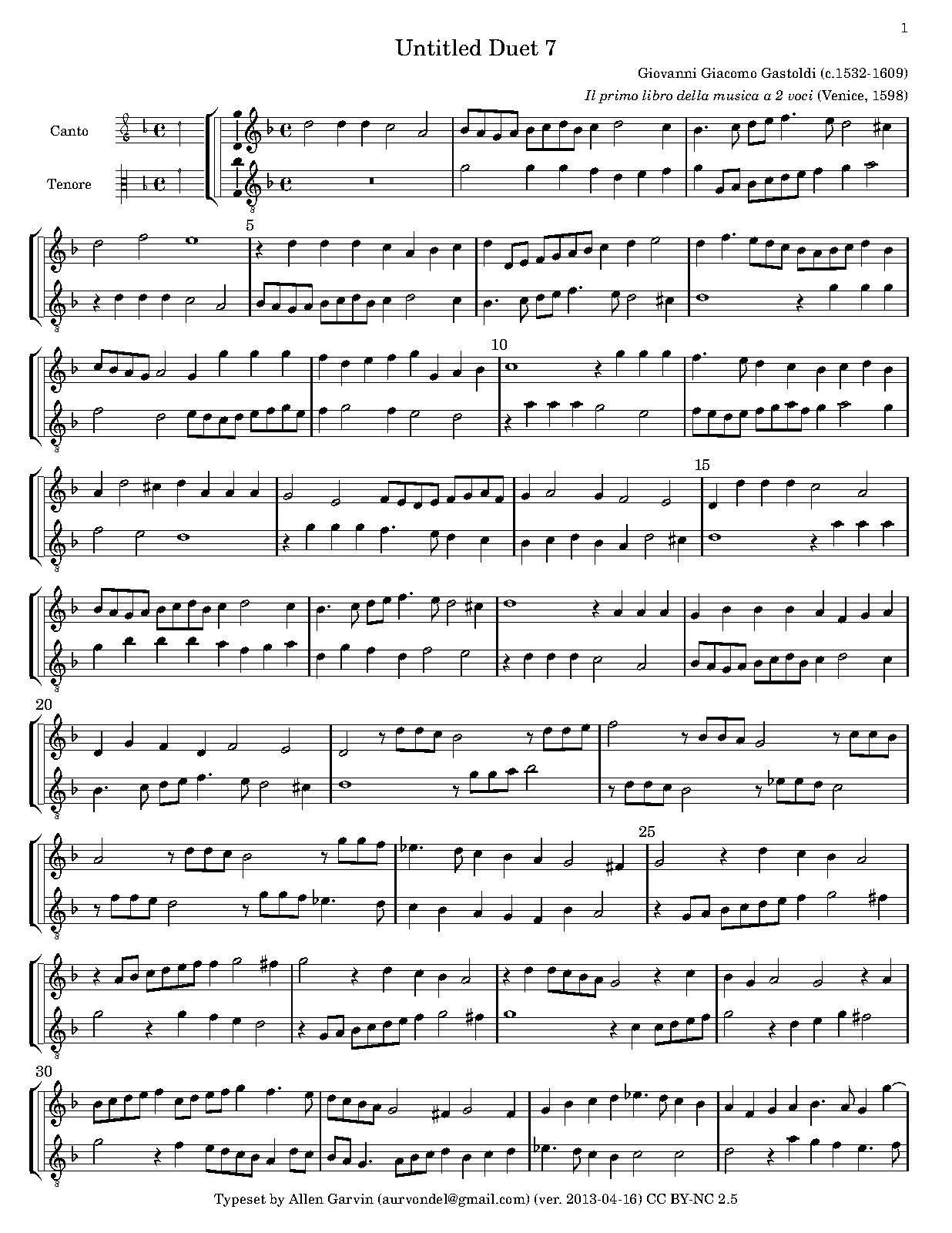 | Extra Information | Il primo libro della musica is the only instrumental work Grove Music lists for Gastoldi. It is comprised entirely of music for 2 voices, though the instrumentation is left unspecified. It contains 38 untexted bicinia, the first 20 of which are by Gastoldi. |