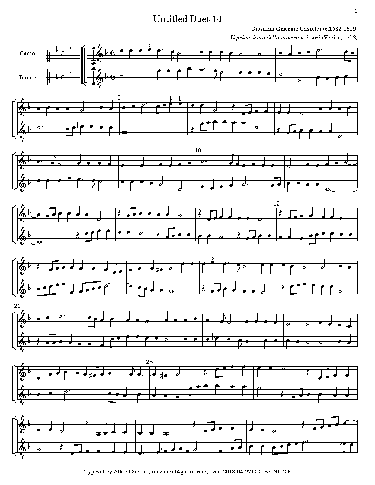 | First Publication | 1598 in Il primo libro della musica a due voci (No.14) |