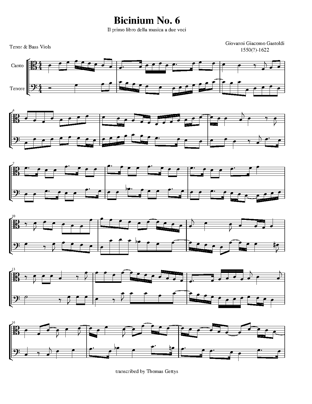 | Extra Information | Il primo libro della musica is the only instrumental work Grove Music lists for Gastoldi. It is comprised entirely of music for 2 voices, though the instrumentation is left unspecified. It contains 38 untexted bicinia, the first 20 of which are by Gastoldi. |
