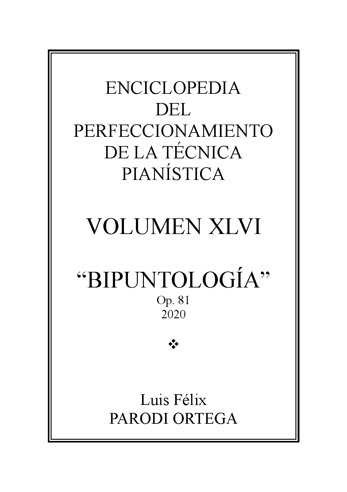 | Extra Information | BIPUNTOLOGÍA OP. 81. ES EL VOLUMEN XLVI DE MI "ENCICLOPEDIA DEL PERFECCIONAMIENTO DE LA TÉCNICA PIANÍSTICA".