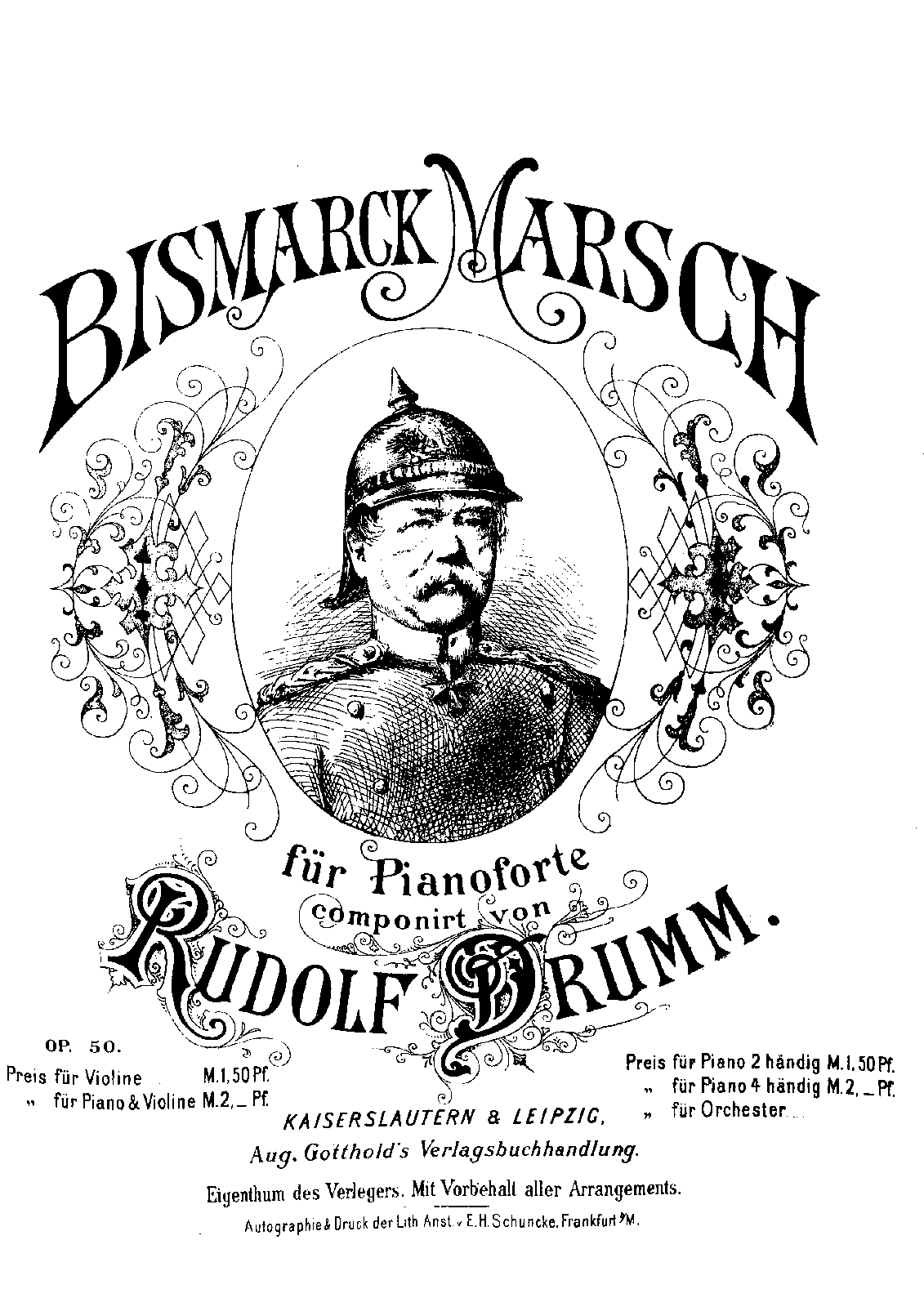 Published for piano solo in 1885 - Monatsbericht (1885), p.174 (under the title Fürst Bismarck-Marsch) ; for violin solo later that year Monatsbericht (1885), p.191; also for violin and piano Monatsbericht (1885), p.197. Another piano version (same publisher, but as Bismarck-Marsch) published 1886 (Monatsbericht (1886), p.80.)