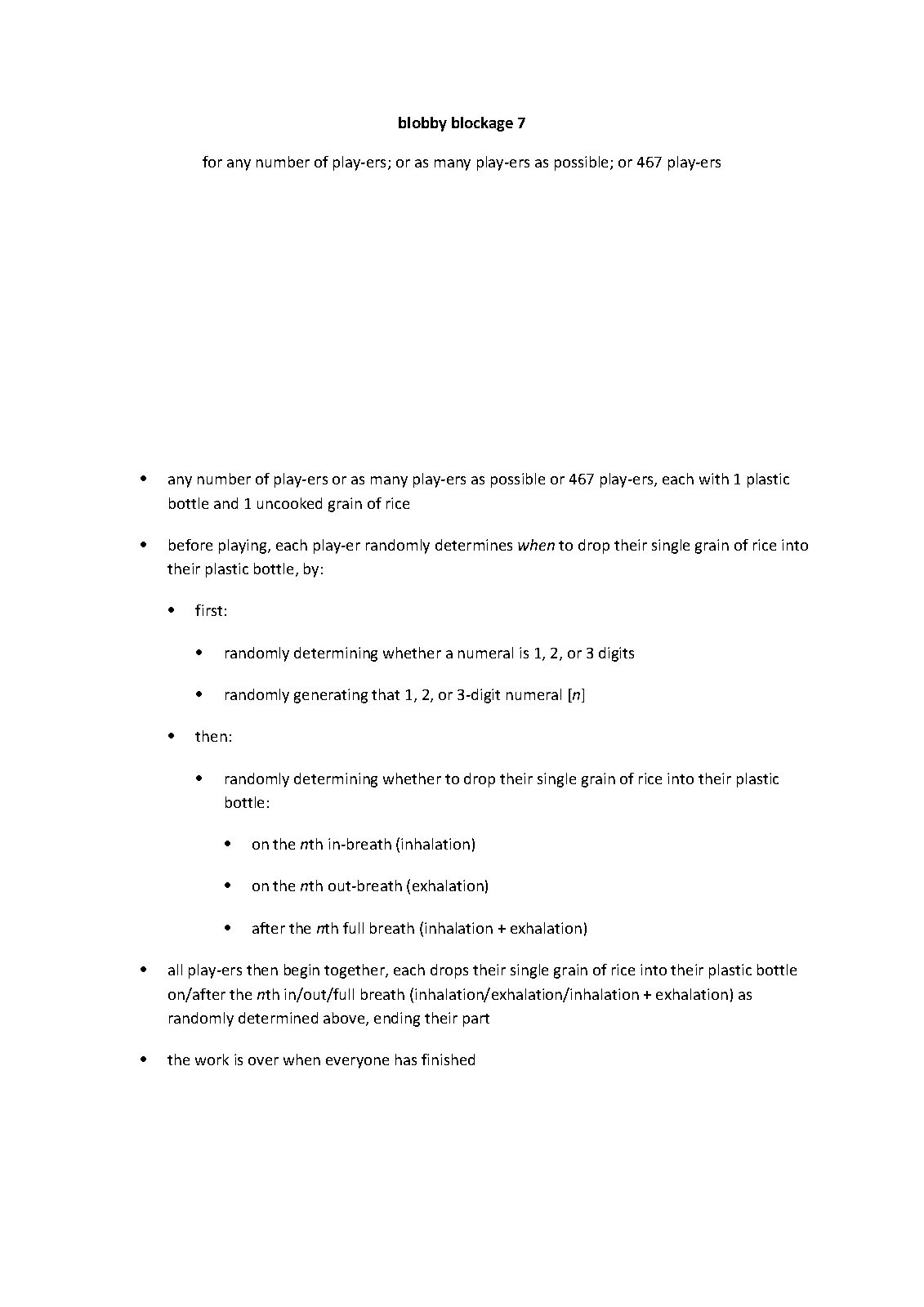 | Instrumentation | any number of play-ers or as many play-ers as possible or 467 play-ers, each with 1 plastic bottle and 1 uncooked grain of rice |