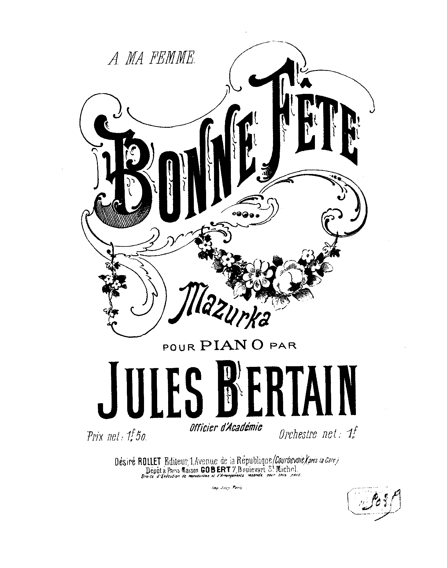 | Copyright Information | Publication noted in the Bibliographie de la France : 78e année, 2e série, Nº 45, 9 Novembre 1889, p.763, reg.4788 (arr. piano) 79e année, 2e série, Nº 9, 1er Mars 1890, p.122, reg.882 (orchestra). |