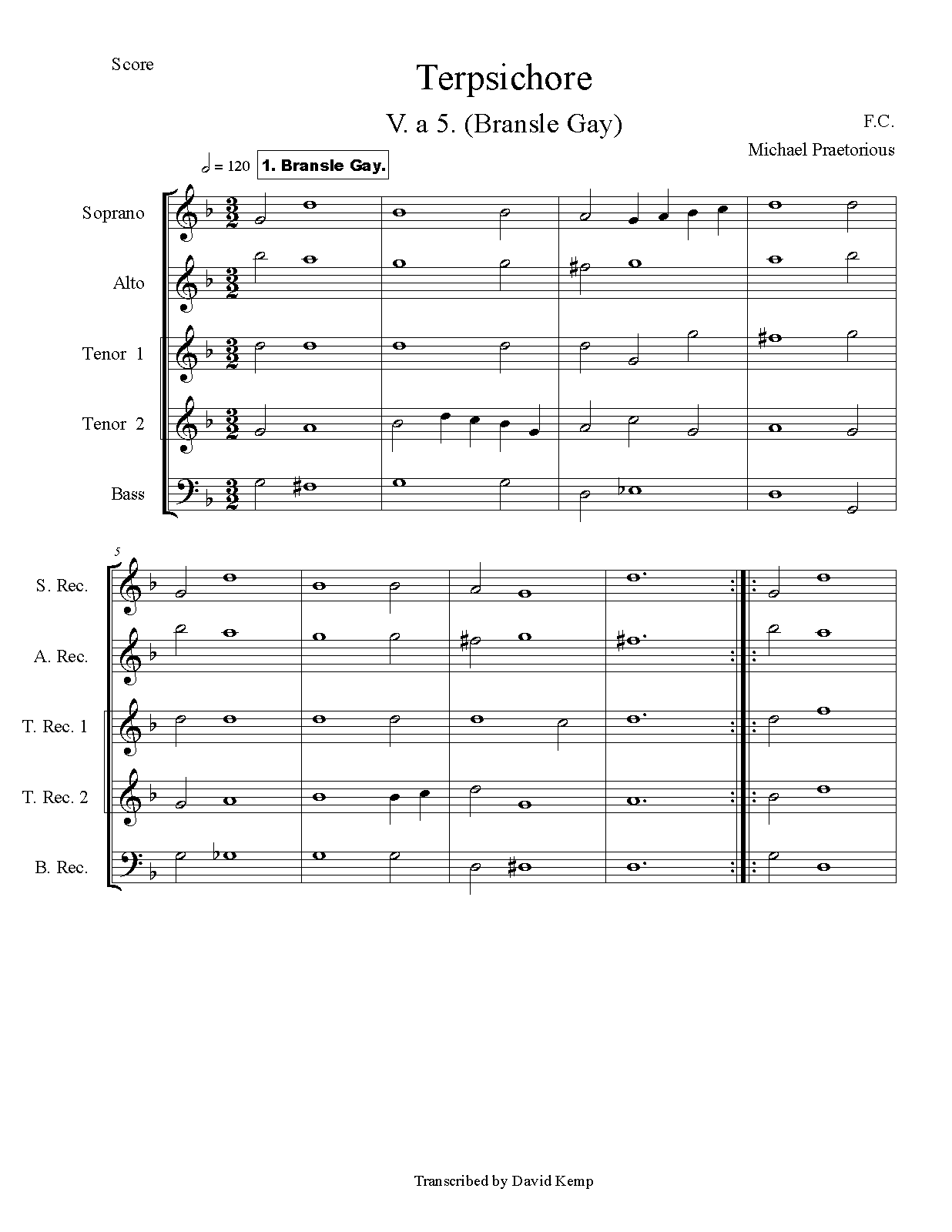 | Extra Information | These pieces were assembled and arranged by Praetorius for his 1612 collection. It is unknown how many, or if any, of the works in the collection were actually composed by Caroubel as opposed to being popular dance tunes arranged by him. The instrumentation is not specified in the original, and simply listed as "à 5" |