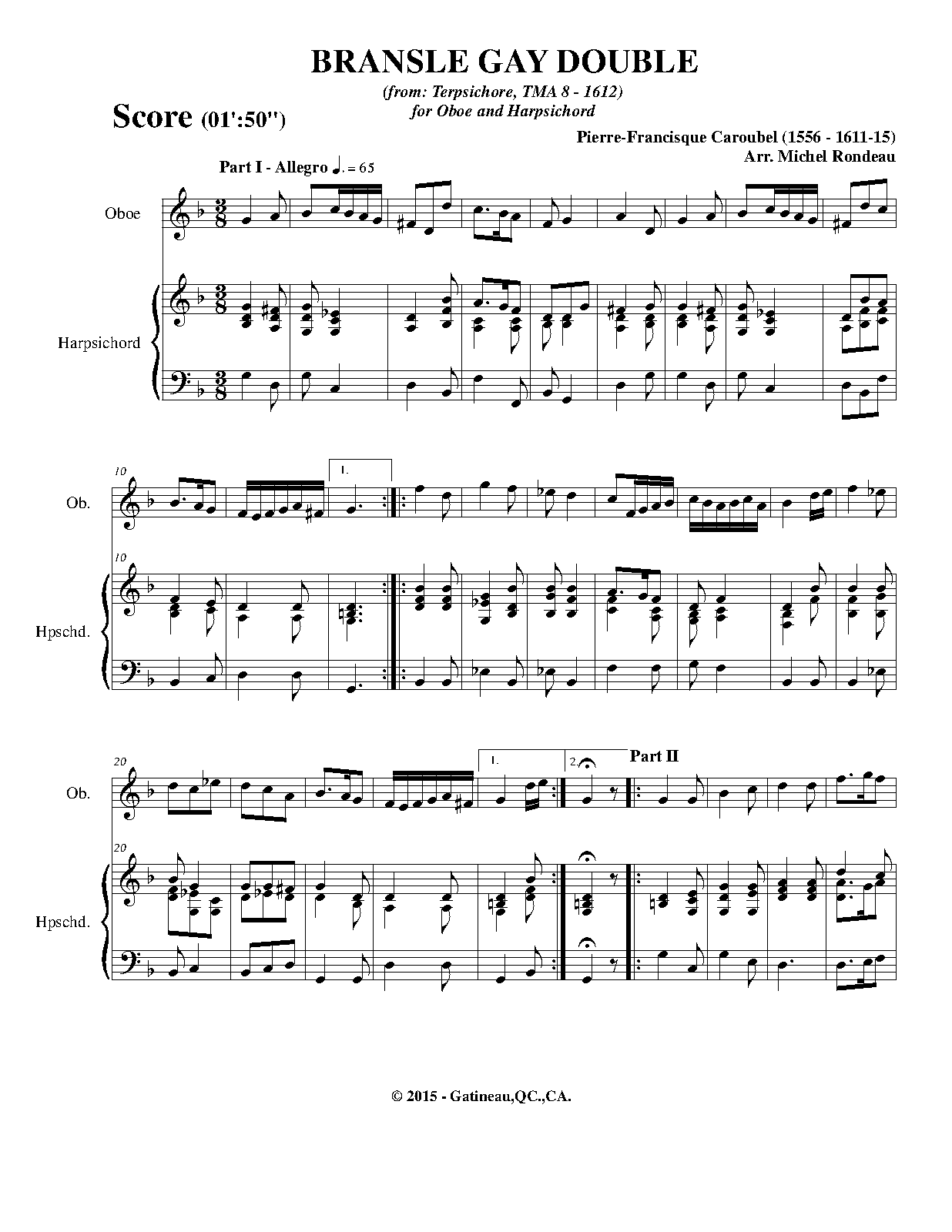 These pieces were assembled and arranged by Praetorius for his 1612 collection. It is unknown how many, or if any, of the works in the collection were actually composed by Caroubel as opposed to being popular dance tunes arranged by him. The instrumentation is not specified in the original, and simply listed as "à 5"