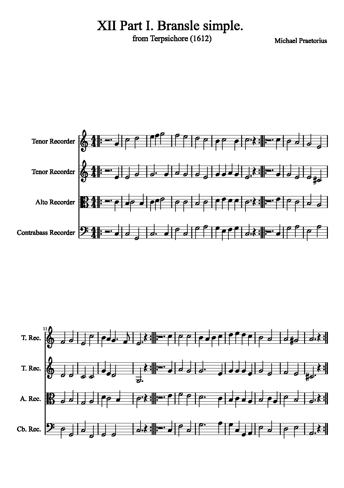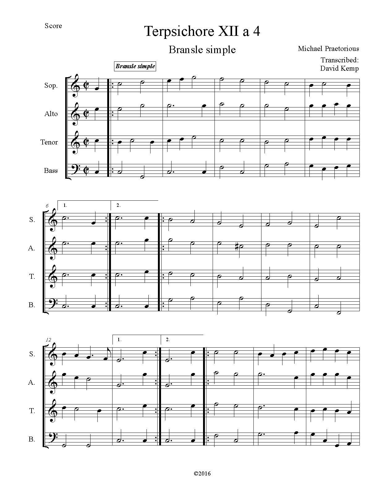 Misc. Notes Terpsichore XII a suite of Bransle simple transcribed for 1 Soprano 1 Altos 1 Tenor 1 Bass