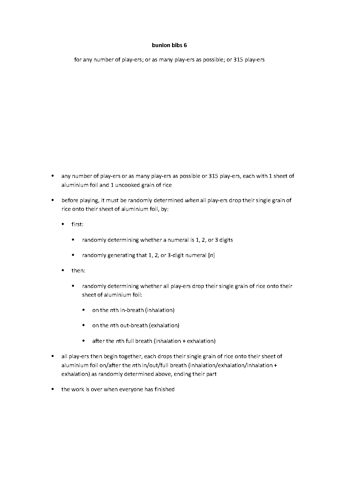 | Instrumentation | any number of play-ers or as many play-ers as possible or 315 play-ers, each with 1 sheet of aluminium foil and 1 uncooked grain of rice |