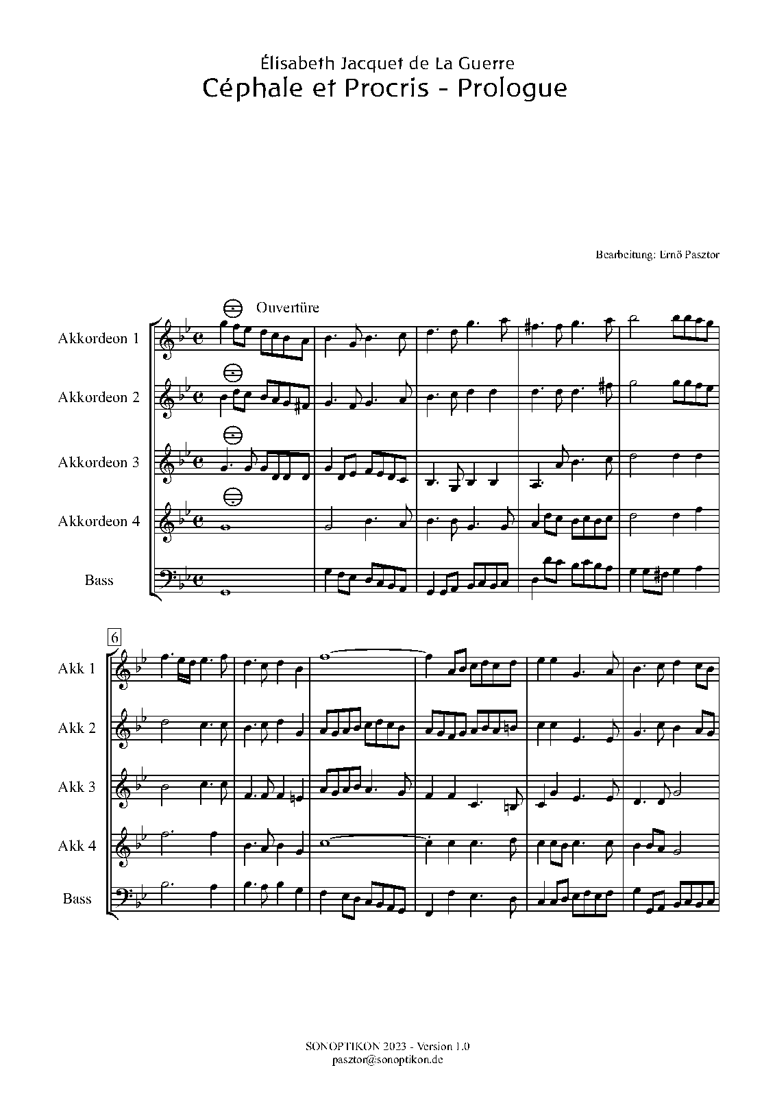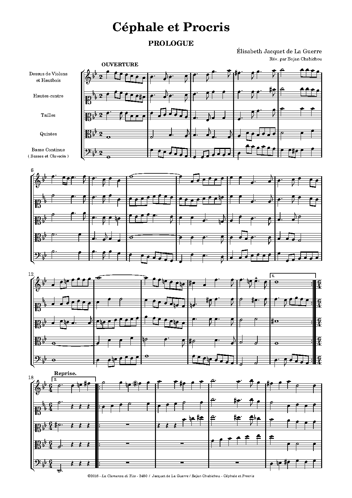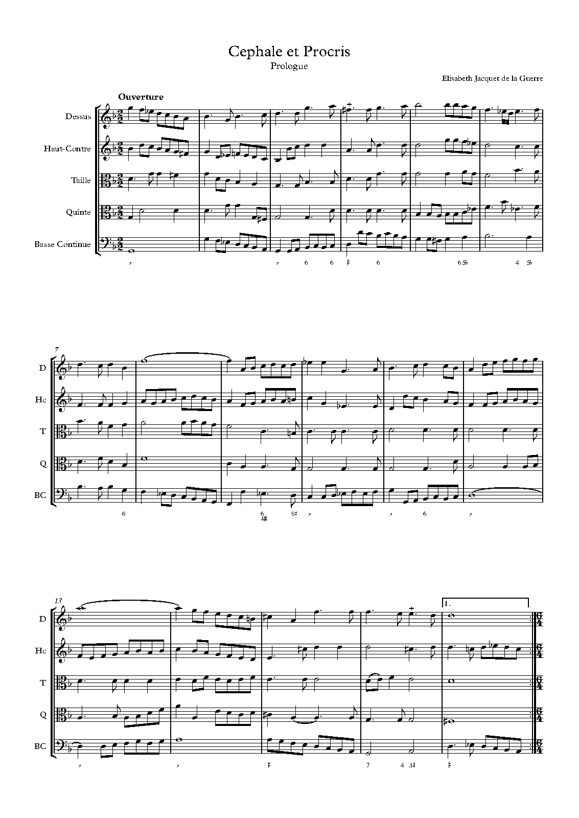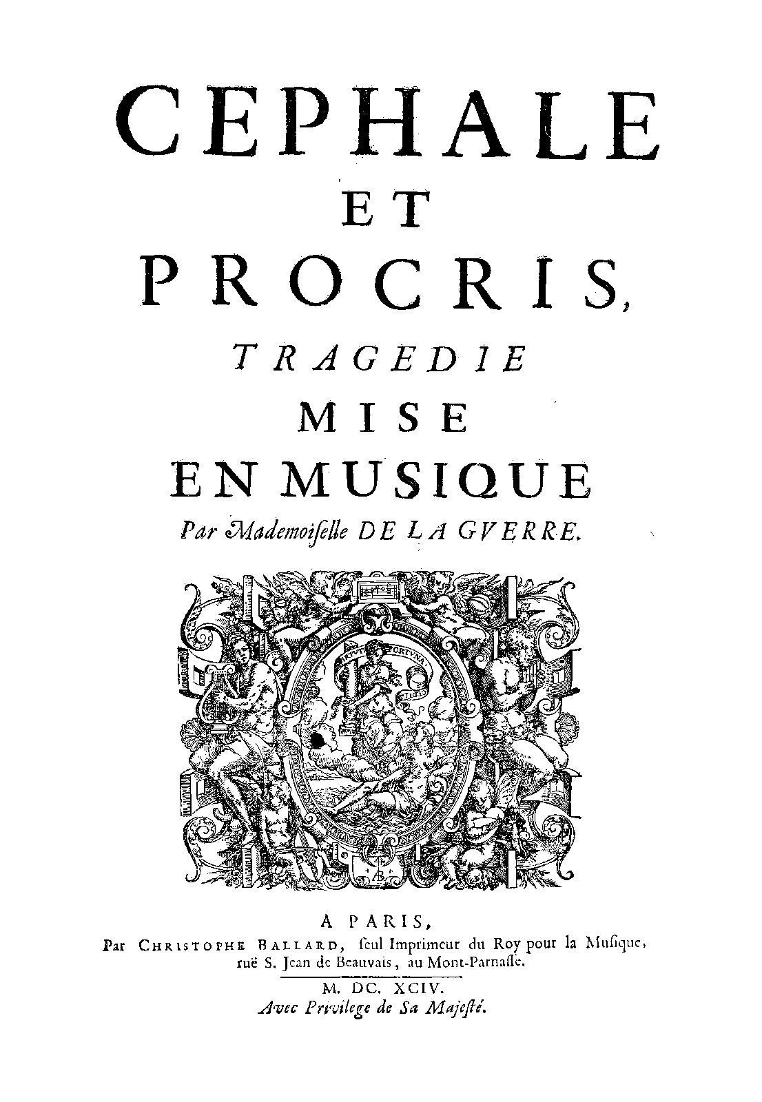 | Extra Information | Jacquet de La Guerre's original score was most likely written in five parts, after the tradition established by Lully. As only Ballard's partition reduite survives, however, only the upper two instrumental parts and the basse continue are extant. |
