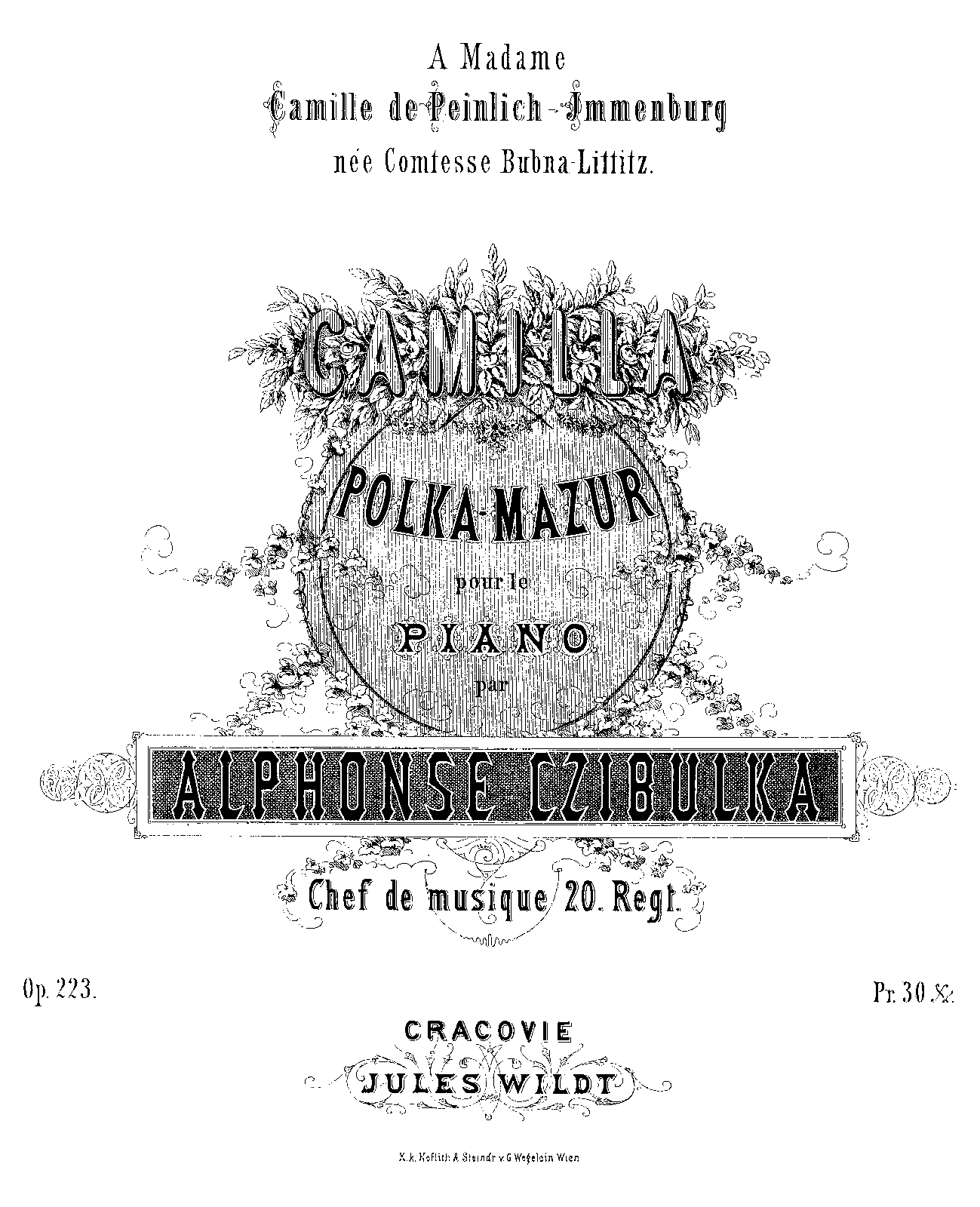 | Dedication | Camille de Peinlich Immenburg, née Comtesse Bubna-Littiz |