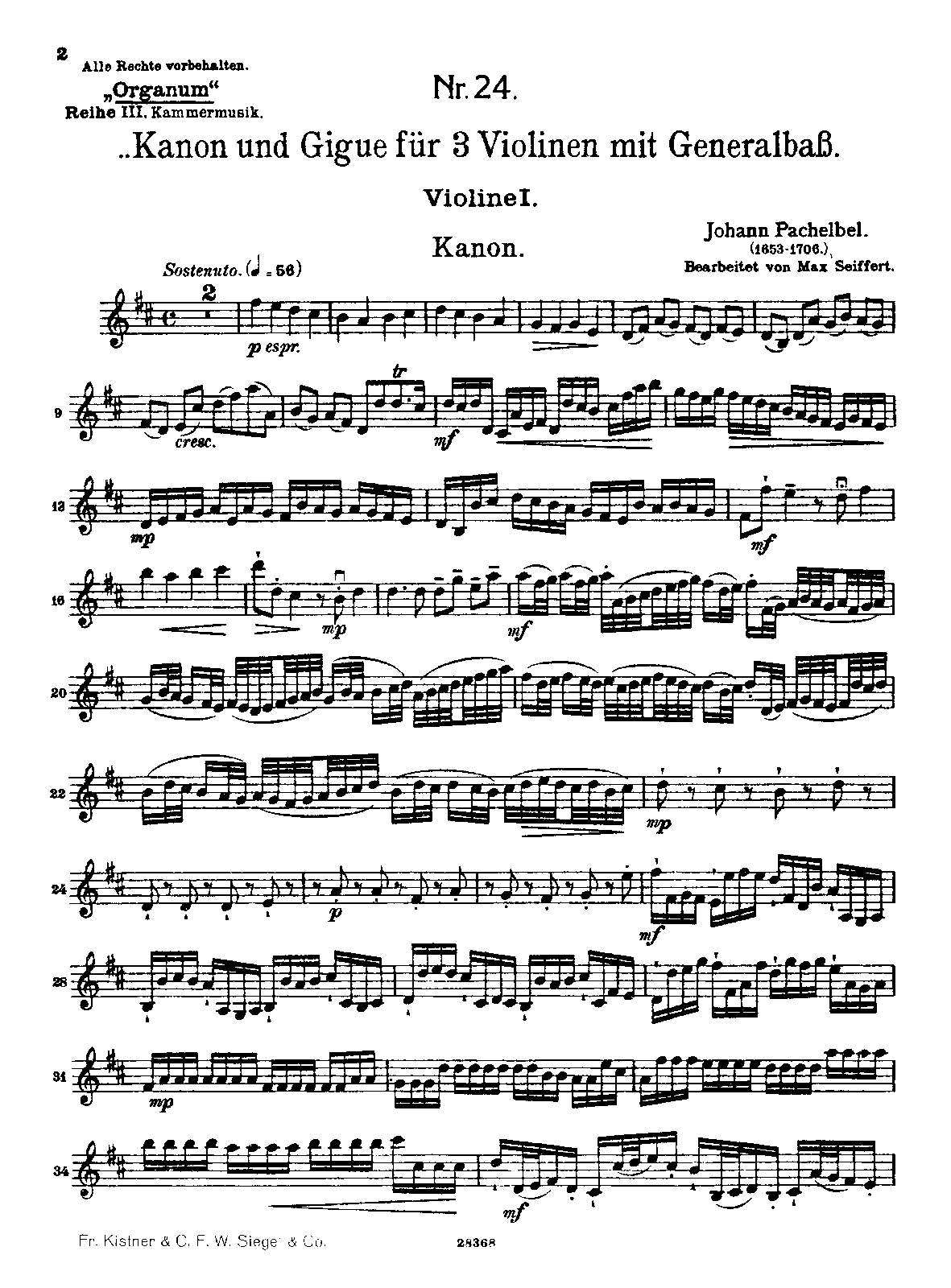 | First Publication. | 1919, in Archiv für Musikwissenschaft I (1918–19) Gustav Beckmann: "Johann Pachelbel als Kammerkomponist", pp.267–74. (The Canon is found on pp.271-74). |