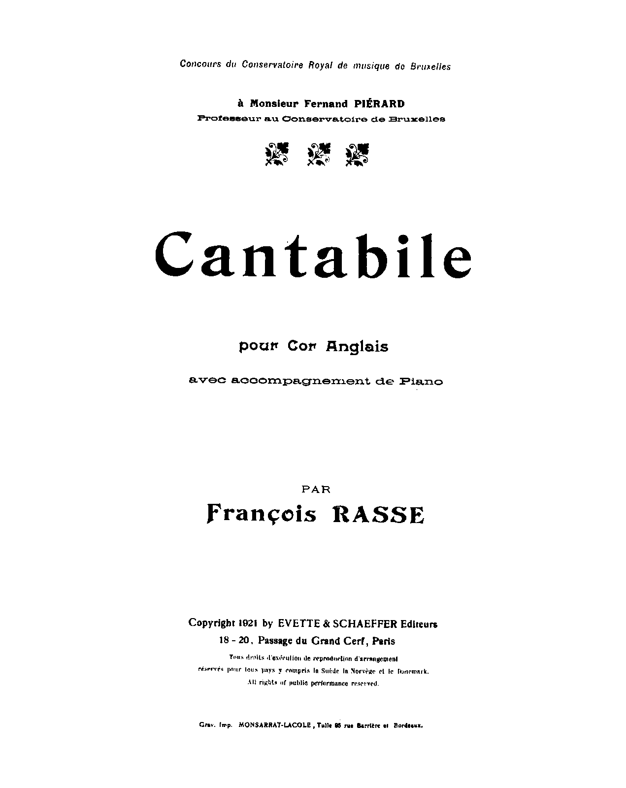 | Dedication | à Monsieur Fernand Piérard, Professeur au Conservatoire Royal de musique de Bruxelles |