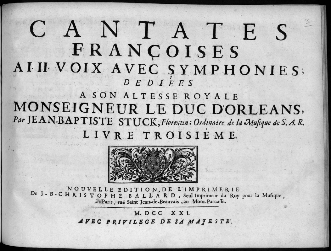 Content: P. [3] [Premier livre] "Cephale et l'aurore" (La nuit d'un voile obscur) [1 voix, 1 fl., 2 vl., alt (hte-contre), b.]. P. [29] [Troisieme livre] "Les bains de Tomery" (Quel spectacle pompeux) [1 voix, 2 vl., b.]. P. [48] [Troisieme livre] "Heraclite et Democrite" (Dans un abîme affreux) [2 voix, 2 vl., b.]. P. [80] [Quatrieme livre] "Psiché" (Ah! daignés écouter Psiché) [1 voix, 1 vl., 1 vl. de g., b.]. P. [98] [Deuxieme livre] "La prise de Lerida" (Assés et trop longtems, les horribles tempêtes) [1 voix, 1 vl., 1 vl. de g.]