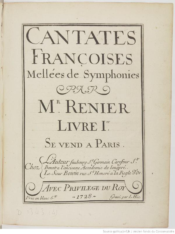 | Instrumentation | 1. voice (C1 clef), viol, continuo 2. voice (C3 clef), orchestra (flutes, violins), continuo 3. voice (C1 clef), "avec symphonie" (instruments unspecified), continuo 4. "Duo", 2 voices (G2, F4 clefs), continuo |