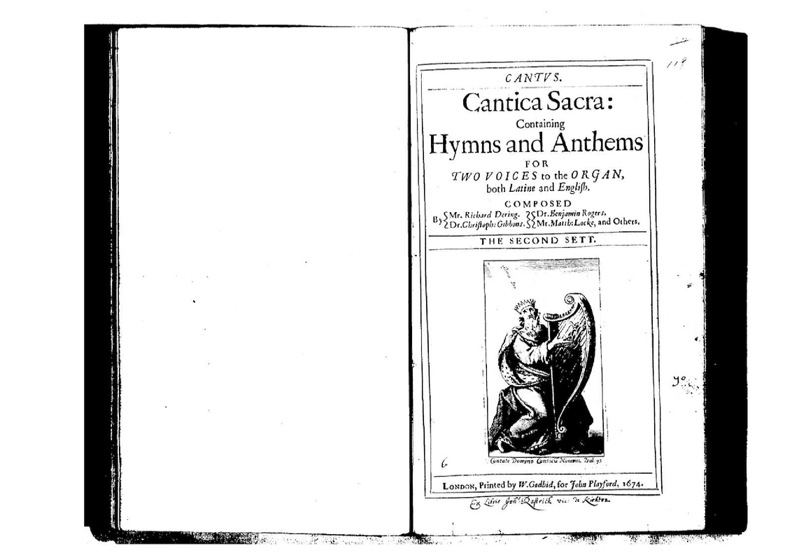 Compositions by Matthew Locke, Christopher Gibbons, John Playford, Richard Dering, Henry Lawes, Benjamin Rogers, George Jeffreys, Michael Wise, John Jackson, Isaac Blackwell, John Playford.