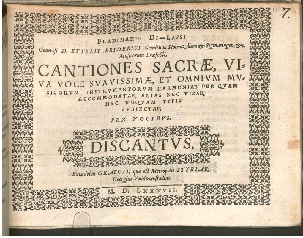 | Alternative. Title | Cantiones sacrae, viva voce svavissimae, et omnivm mvsicorvm instrvmentorvm harmoniae per qvam accomodatae, alias nec visae, nec vnqvam typis svbiectae; sex vocibus |