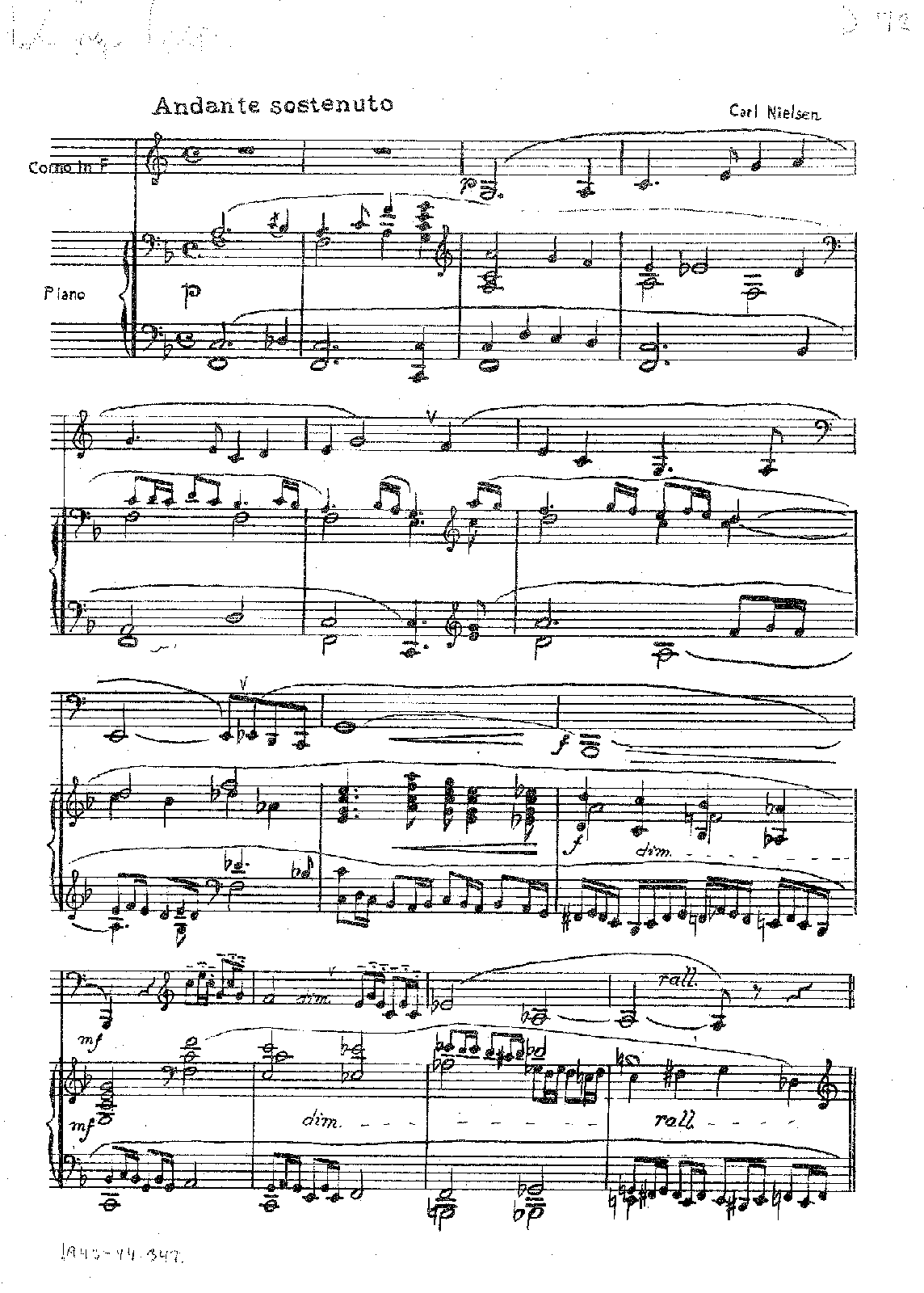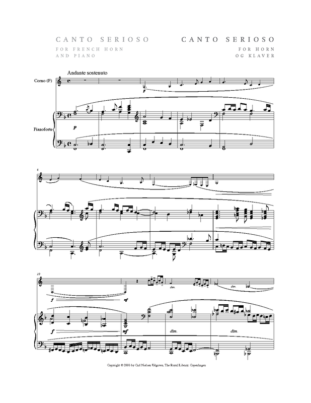 Canto serioso for French horn and piano was composed in connection with a competition taking place on 24 April 1913: The Royal Danish Orchestra had a vacant horn-player position. Nielsen must have composed the work during April after the competition was announced. In 1916, he re-arranged the work for cello and piano. The title, Canto serioso, emerged apparently long after Nielsen had completed the work.