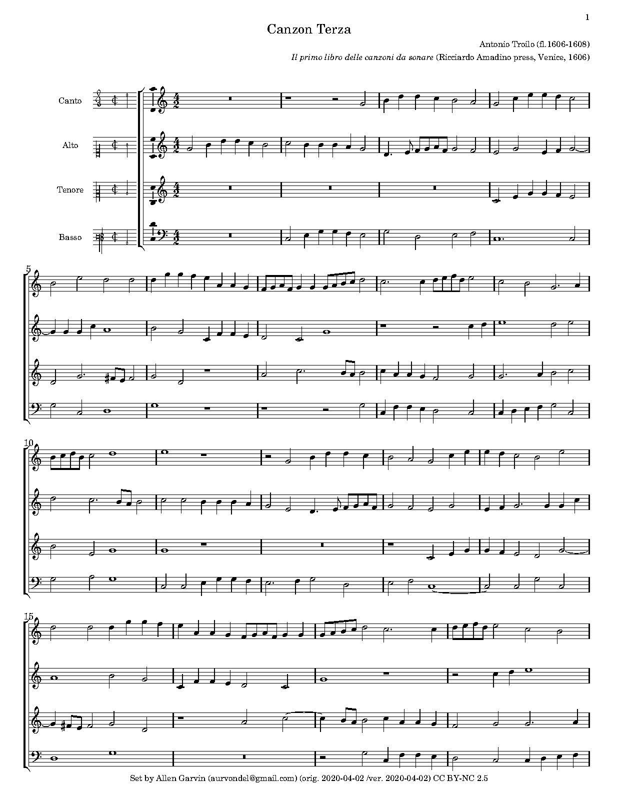 Though the Garvin edition is for 4 instruments, there is a continuo part in the 1606 print. This seems to more or less follow the bass part anyway, so could possibly be done with 3 instruments and continuo, but technically there is both a bass part and a continuo part.