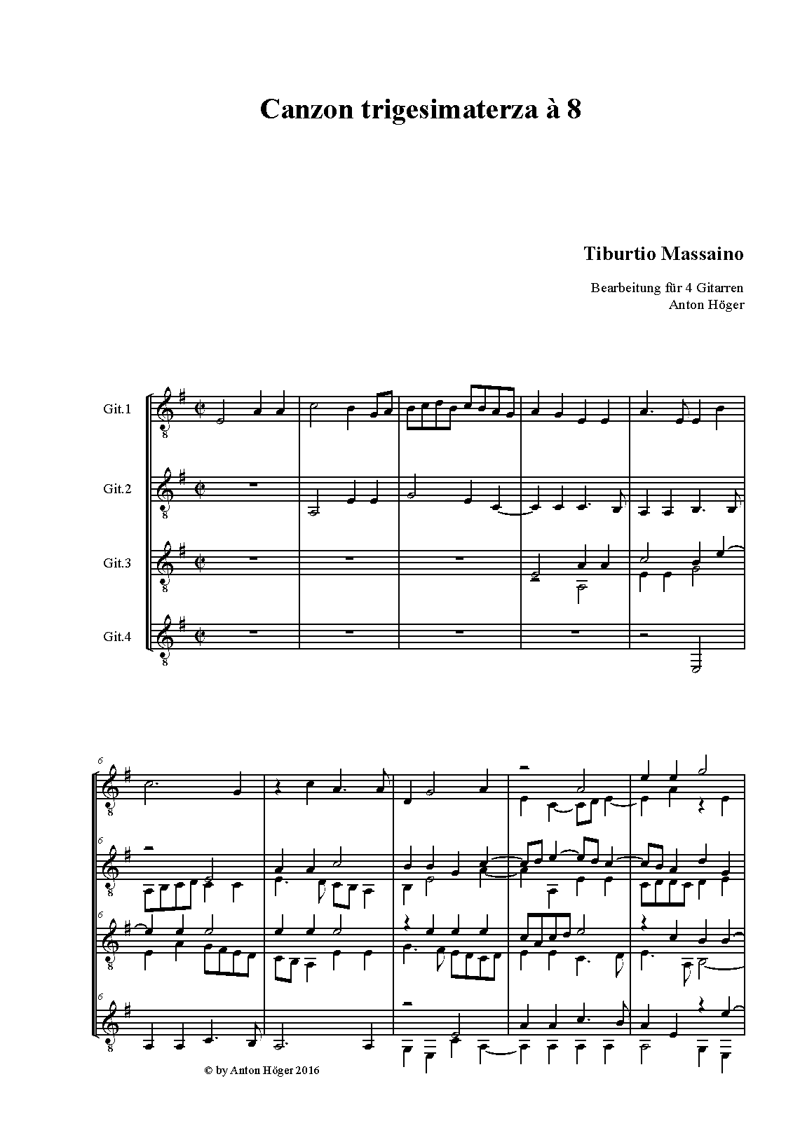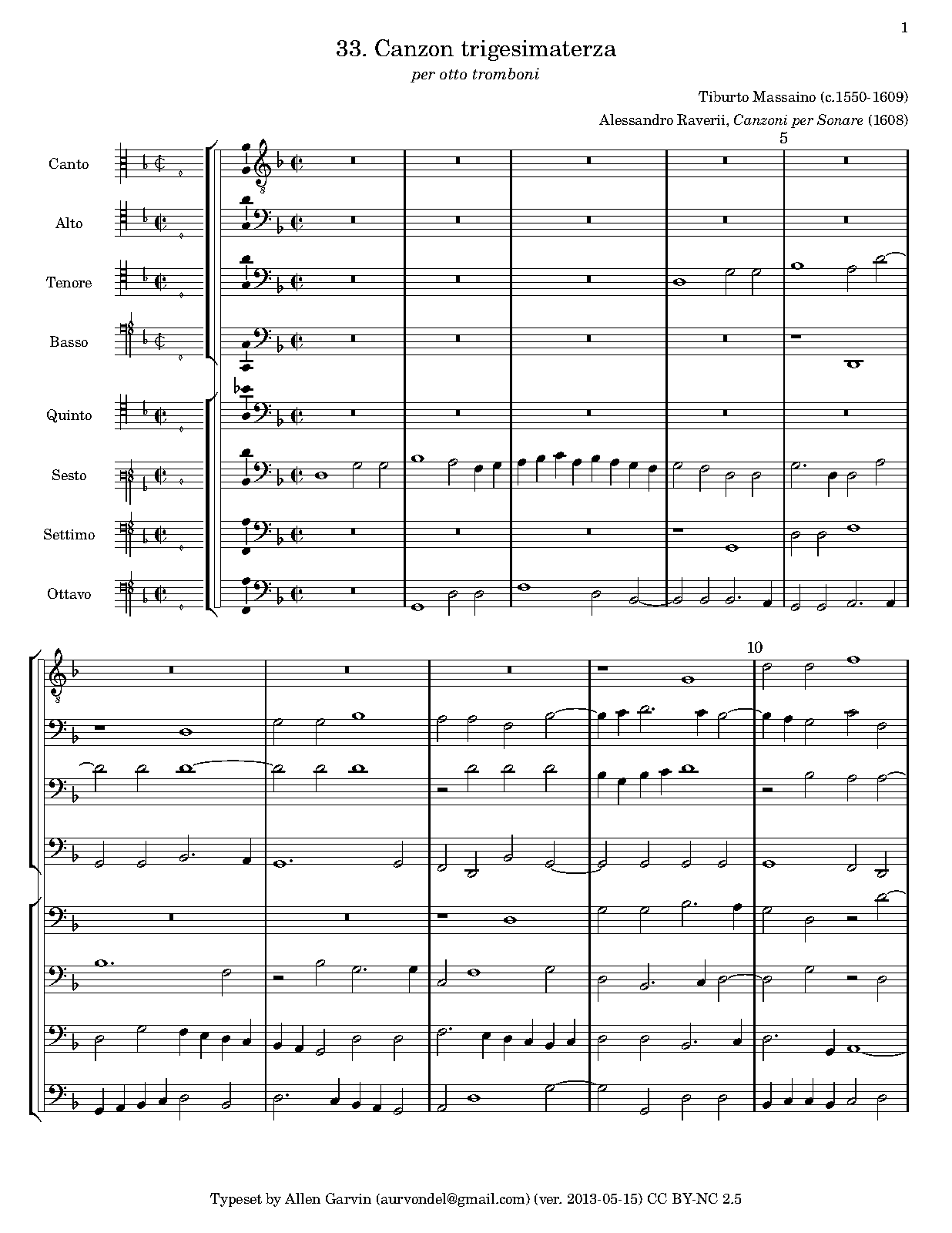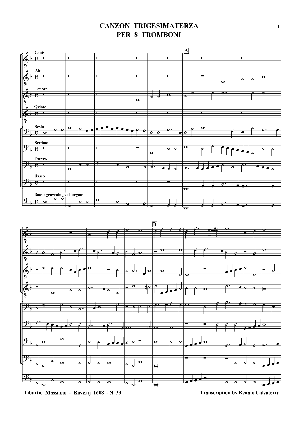 This is the only in Raverii's collection to specify specific instrumentation: 8 trombones. Such instructions were relatively rare for the period. The piece is not especially idiomatic to trombones, and can be easily played on 8 bass instruments, or even a combination of mostly bass with a few tenor instruments.