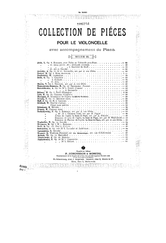 | Genre Categories | Pieces; For cello, piano; Scores featuring the cello; |