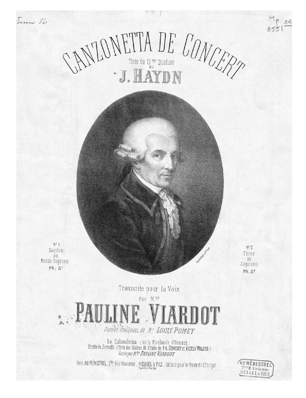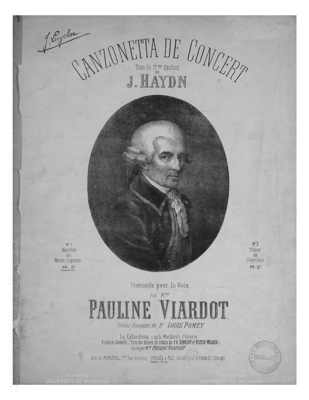 The music of this arrangement is from the Andante cantabile movement of Haydn’s string quartet in F, op. 3 no. 5, the ‘Serenade’, often now attributed to Roman Hoffstetter. The Italian words were taken from the secular cantatas by Nicola Porpora known as ‘La pesca’ and ‘La tempesta’ (1735). According to an American source Pauline Viardot’s work was first published in 1845, but that seems impossible. Manuscripts are at the Bayerische Staatsbibliothek, at Harvard (with a musical variant), and at the Médiathèque Hector Berlioz (one there having orchestral parts).