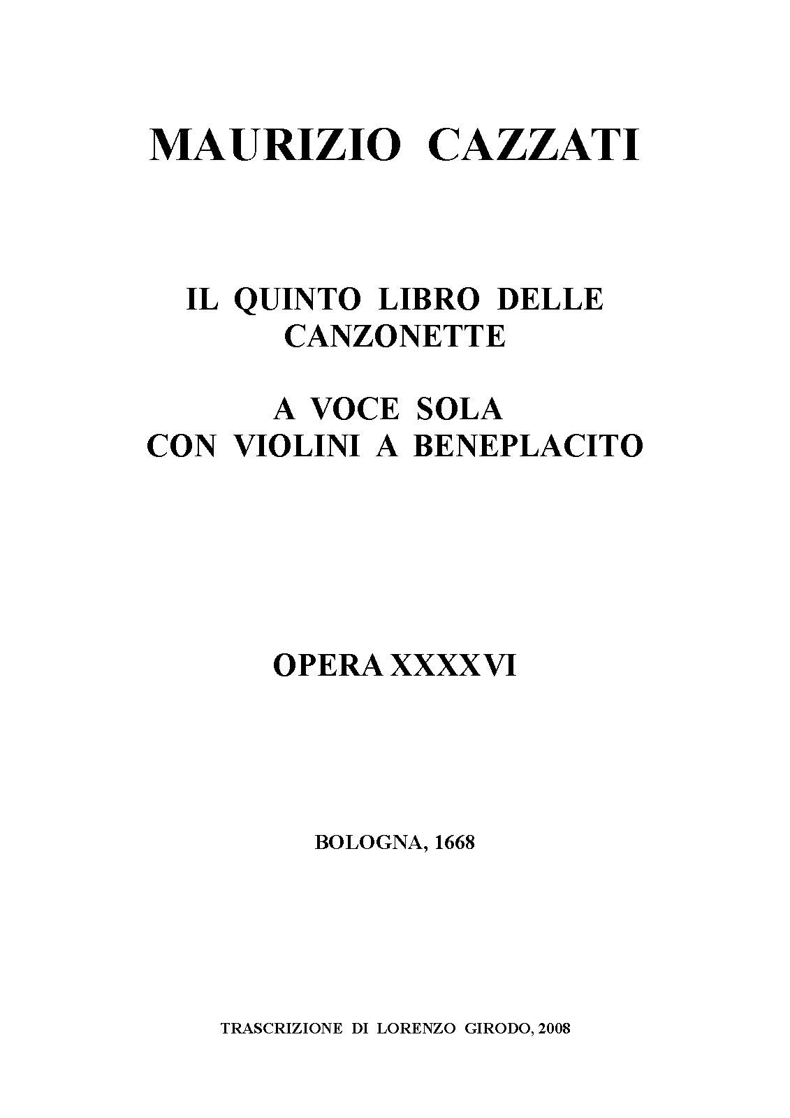 | Alternative. Title | Il Quinto Libro delle Canzonette a voce sola, con Violini a beneplacito, Dedicate all'Illustrissimo Signor Virgilio Giuseppe Maria Davia da Mauritio Cazzati Mastro di Capella in S. Petronio di Bologna, & Accademico Eccitato. Opera XXXXVI |