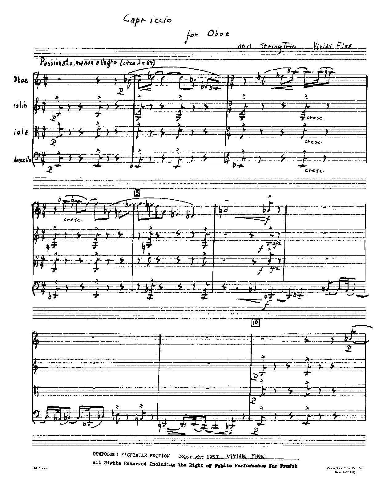 The Capriccio marks a new stage in Fine’s writing—her music is more freely dissonant, key signatures disappear, and tonal references are rare. As a result she stresses melodic line, the talent that was so apparent in her early music…. Rather than a collection of short movements, the piece is designed as one long movement divided into several sections. Each instrument has prominent melodies, sometimes solo and sometimes accompanied, some of which Fine sets as canons.