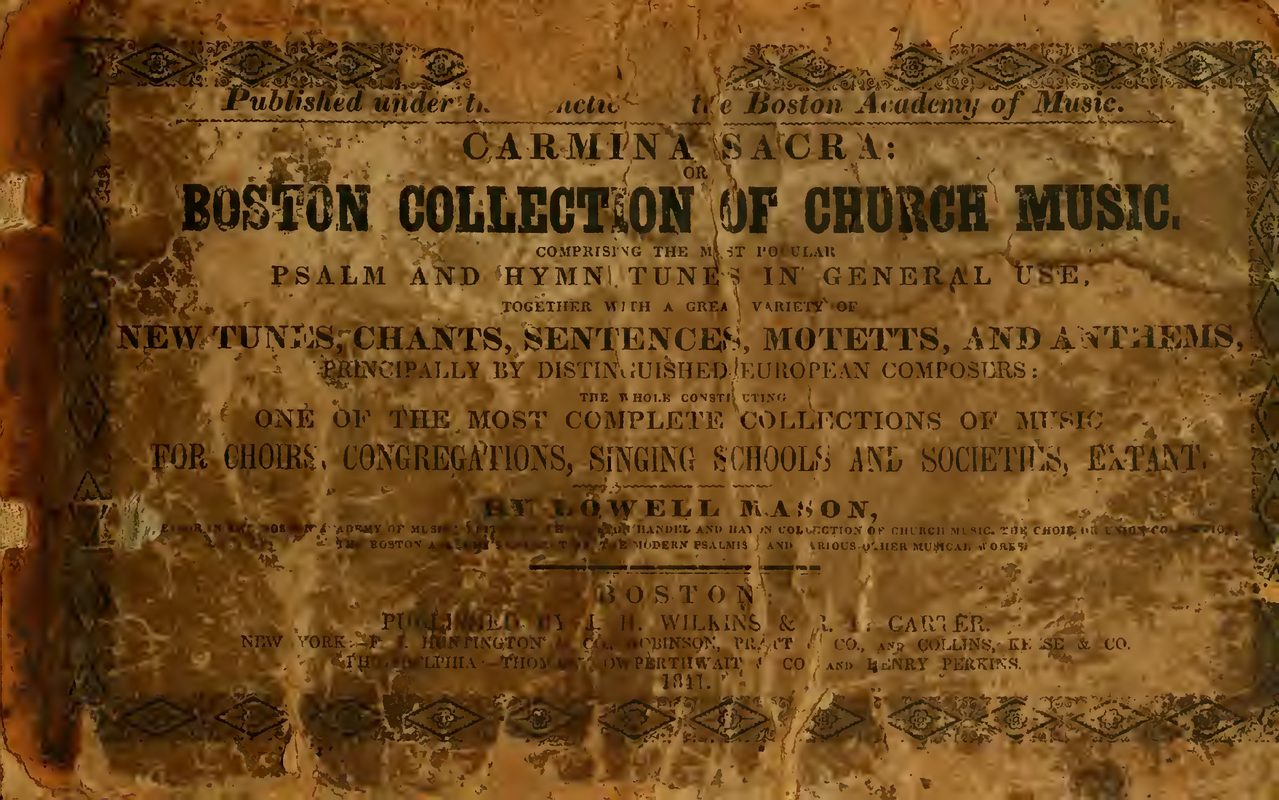 | Alternative. Title | Carmina Sacra: or Boston Collection of Church Music, comprising the most popular psalm and hymn tunes in general use, together with a great variety of new tunes, chants, sentences, motetts, and anthems, principally by distinguished European composers: the whole constituting one of the most complete collections of music for choirs, congregations, singing schools and societies, extant. |