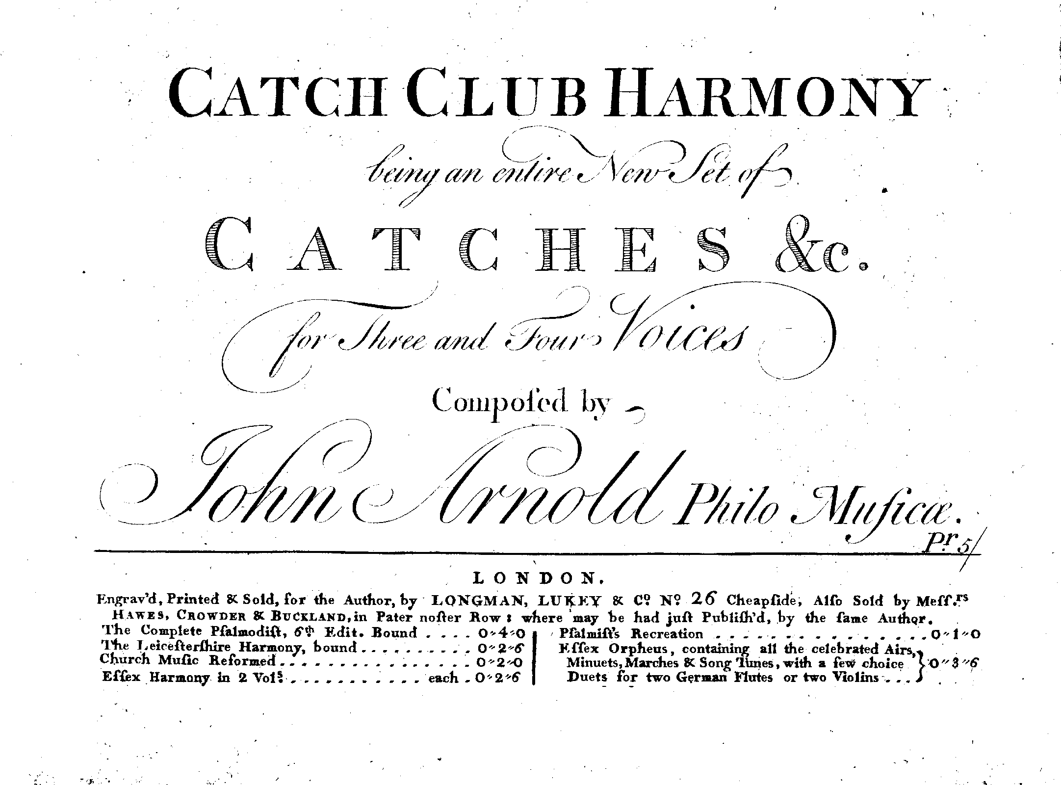 | Alternative. Title | Catch Club Harmony, being an entire new Set of Catches &c. for Three and Four Voices |