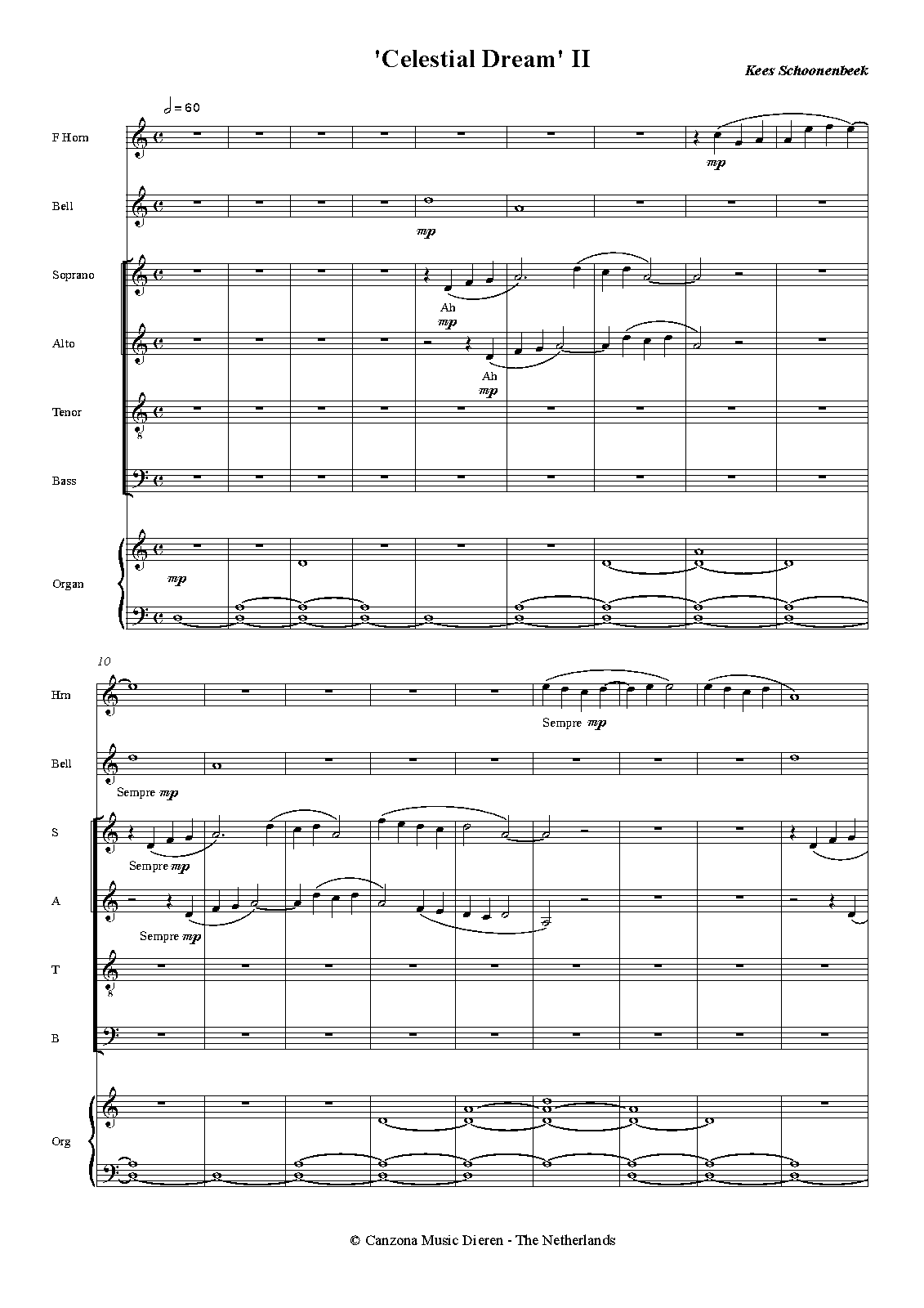 mixed chorus (SATB), horn (F), chimes, synthesizer or organ