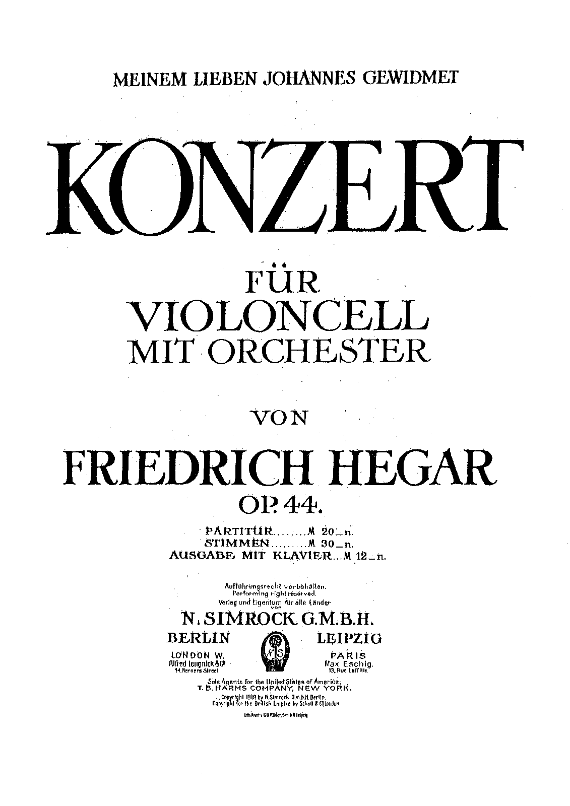 | Dedication | Meinem lieben Johannes gewidmet. The composer's son, the cellist Johannes Hegar (1874-1929) |