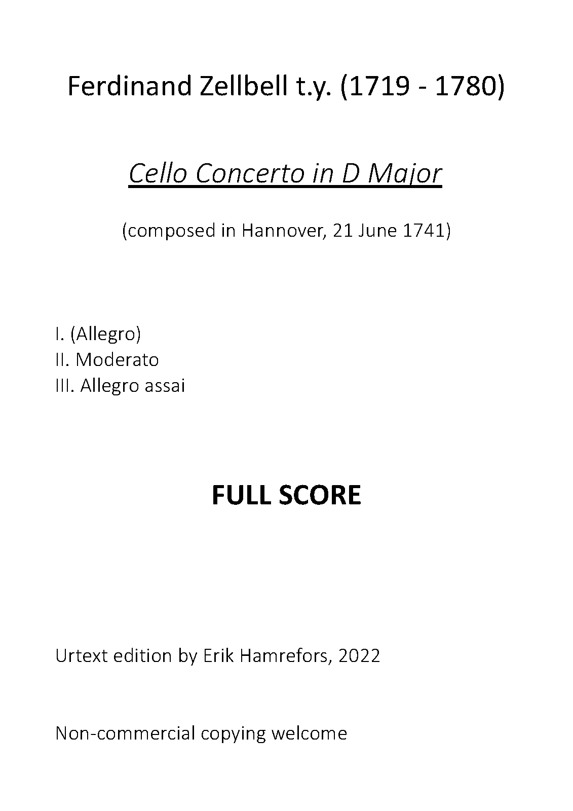 | Extra Information | According to RISM, there is at least one other D major cello concerto attributed to Zellbell (1719-80), with a digital version available (see S-L Saml.Engelhart 143.) |
