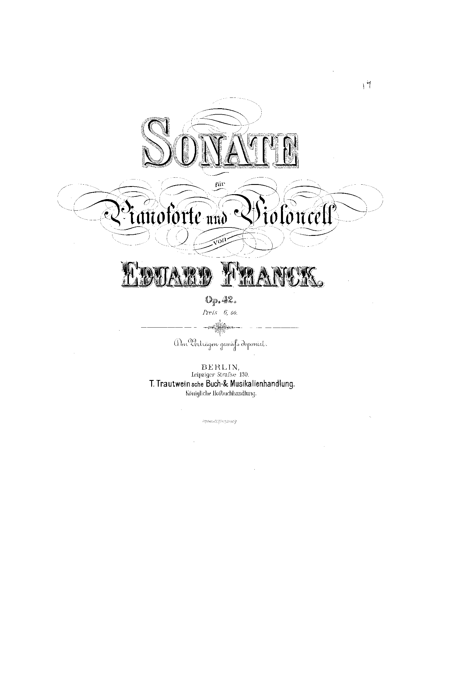 There is also by Eduard Franck a cello sonata no.1 in D major, op.6, published in 1846 by Stern. This has been recorded on a CD with one of Richard Franck's sonatas (no.2 in E-flat minor, Op.36) and Reinecke's 3 pieces for cello and piano; Audite has another CD with both of (Eduard) Franck's cello sonatas together. There are as of spring 2018 at least two recordings of the 2nd sonata Op.42- one on Audite and one on Naxos.
