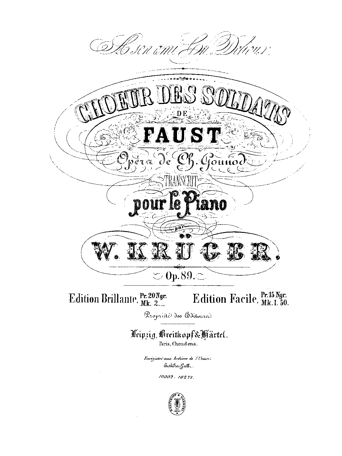 B&H publication listed in HMB as Krüger, W., Op. 89. Choeur des Soldats de Faust, Opéra de Ch. Gounod, transcrit.