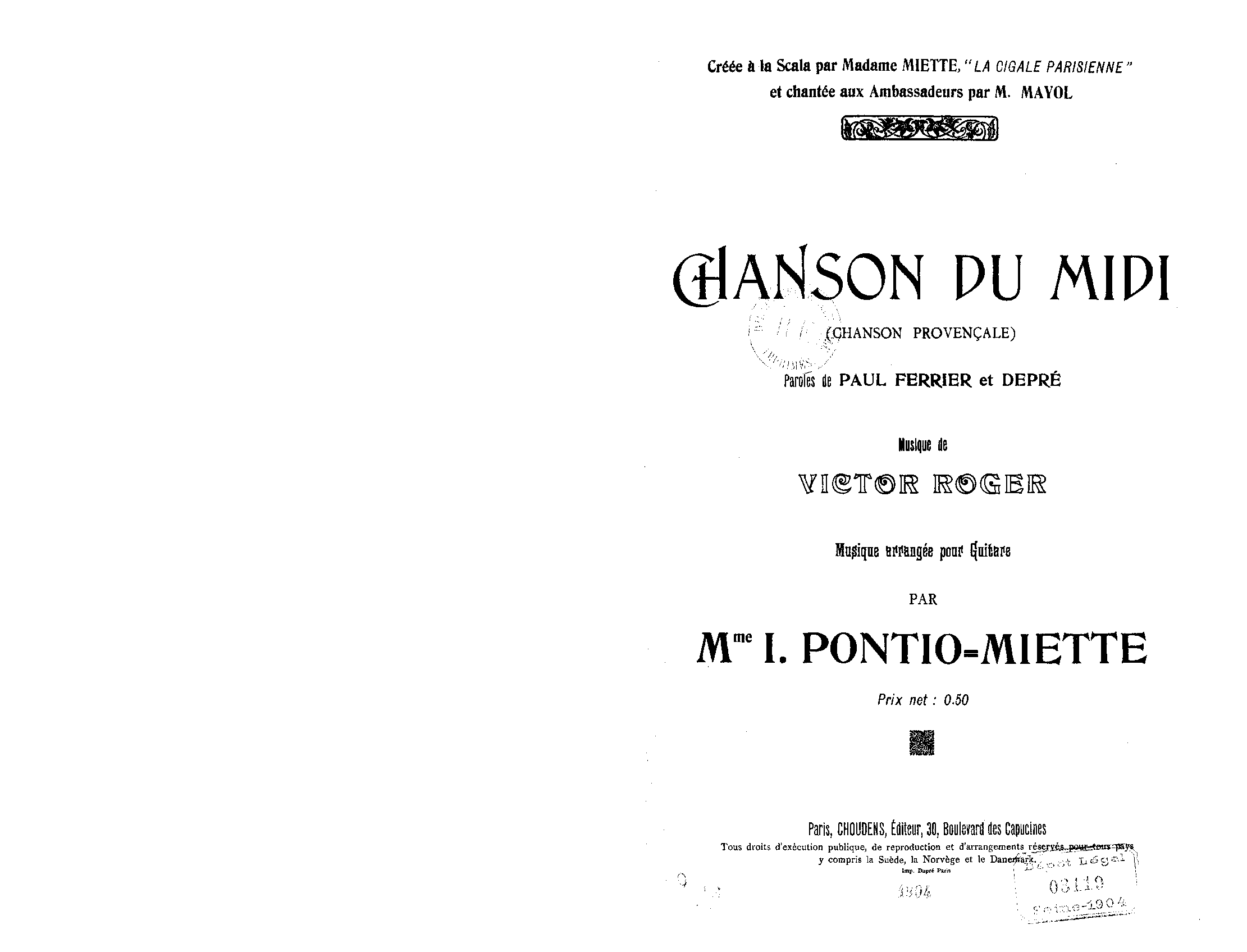 | Dedication | Chantée à la Scala par Mme. Miette "La cigale parisienne" et Mayol aux Ambassadeurs |