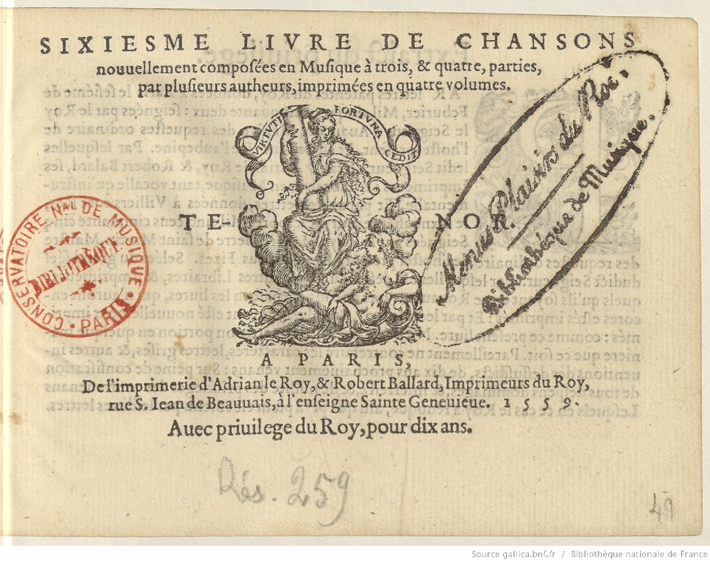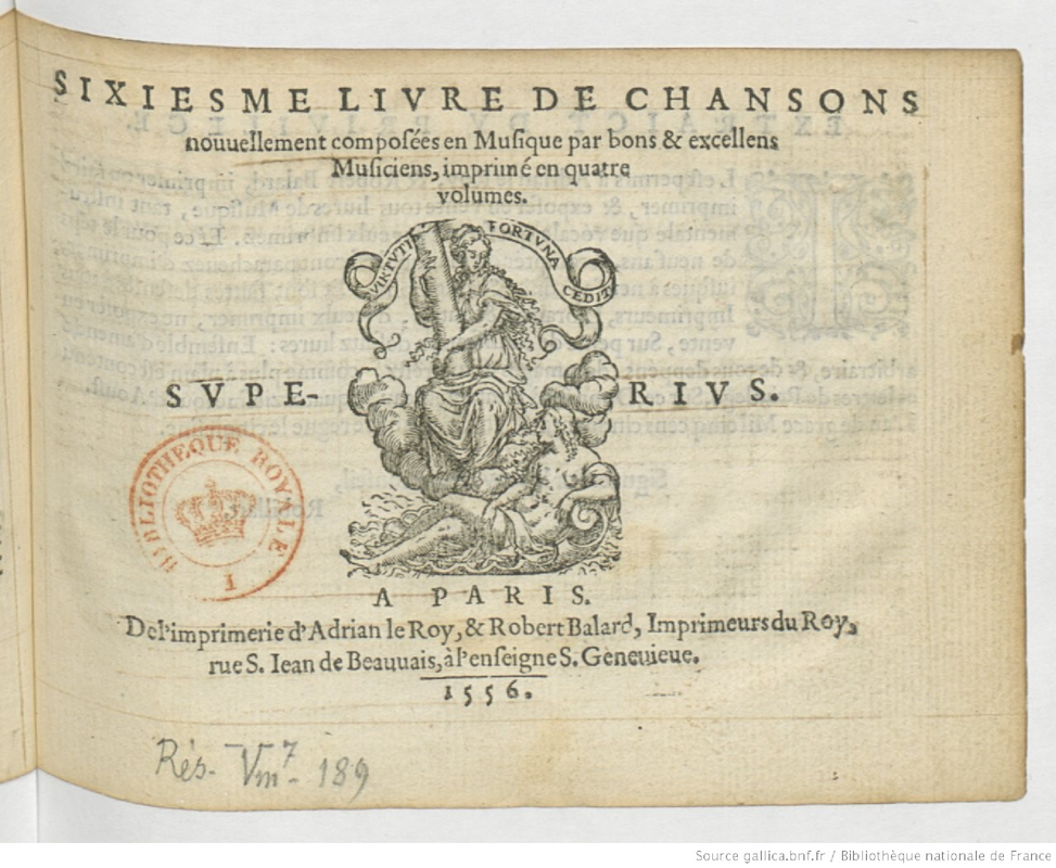 | Alternative. Title | Sixiesme livre de chansons nouvellement composées en musique par bons et excellents musiciens |
