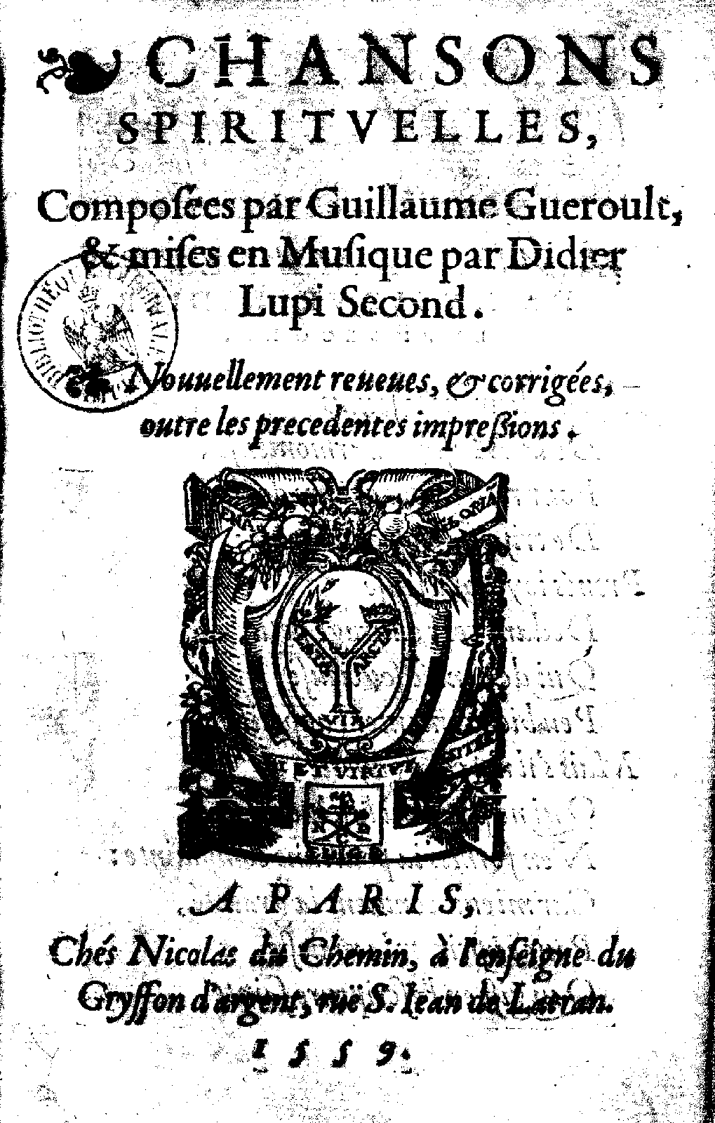 | Alternative. Title | Chansons spirituelles, Composées par Guillaume Gueroult, & mises en Musique par Didier Lupi Second. Nouvellement reveues, & corrigées, outre les precedentes impressions. |