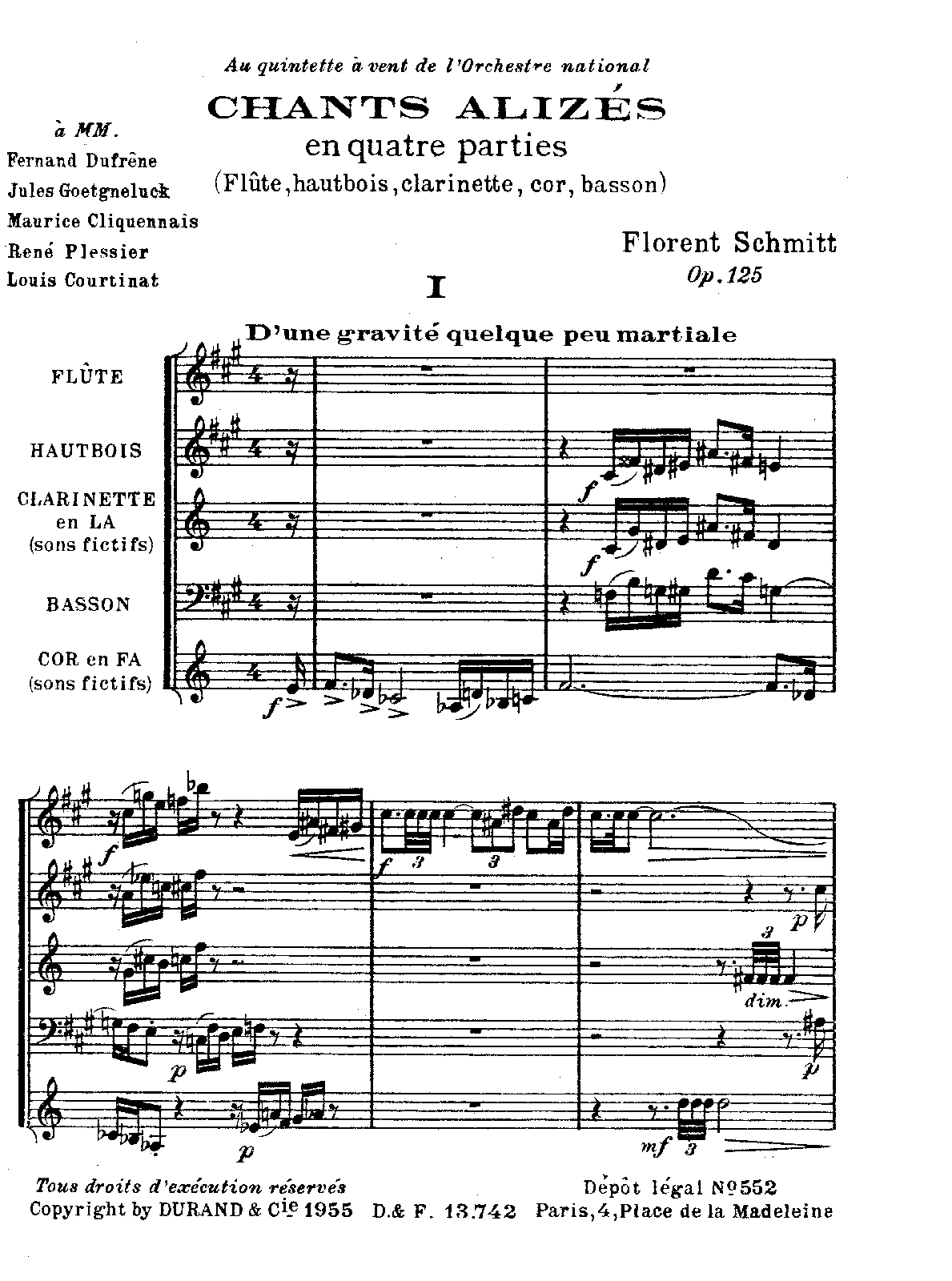 | Dedication | au quintette à vent de l'Orchestre national : à MM. Fernand Dufrêne, Jules Goetgheluck, Maurice Cliquennois, René Plessier, Louis Courtinat |