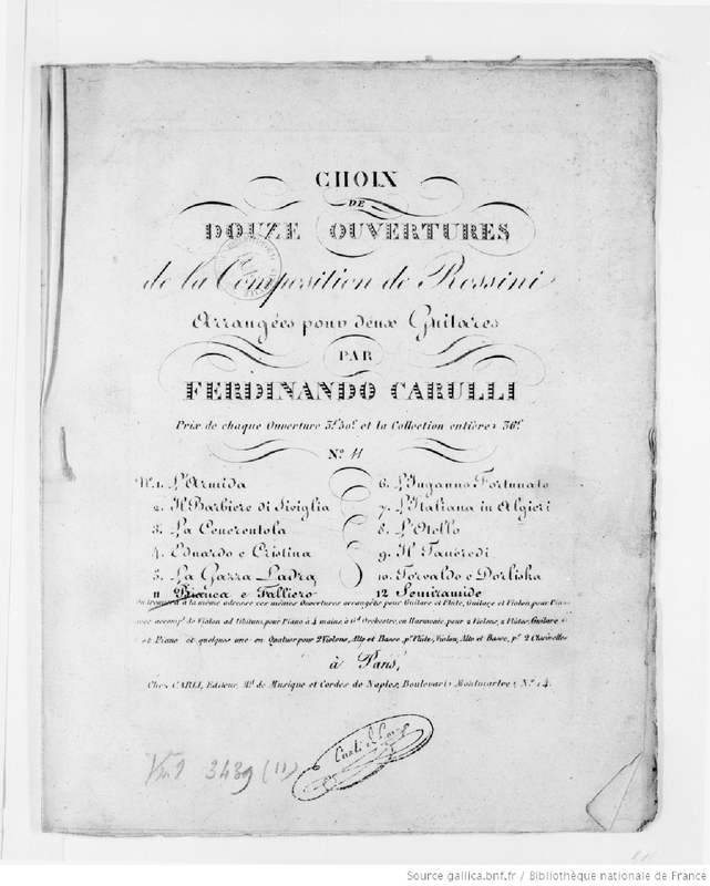 | Alternative. Title | Choix de 12 ouvertures de la composition de Rossini arrangées pour deux guitares |