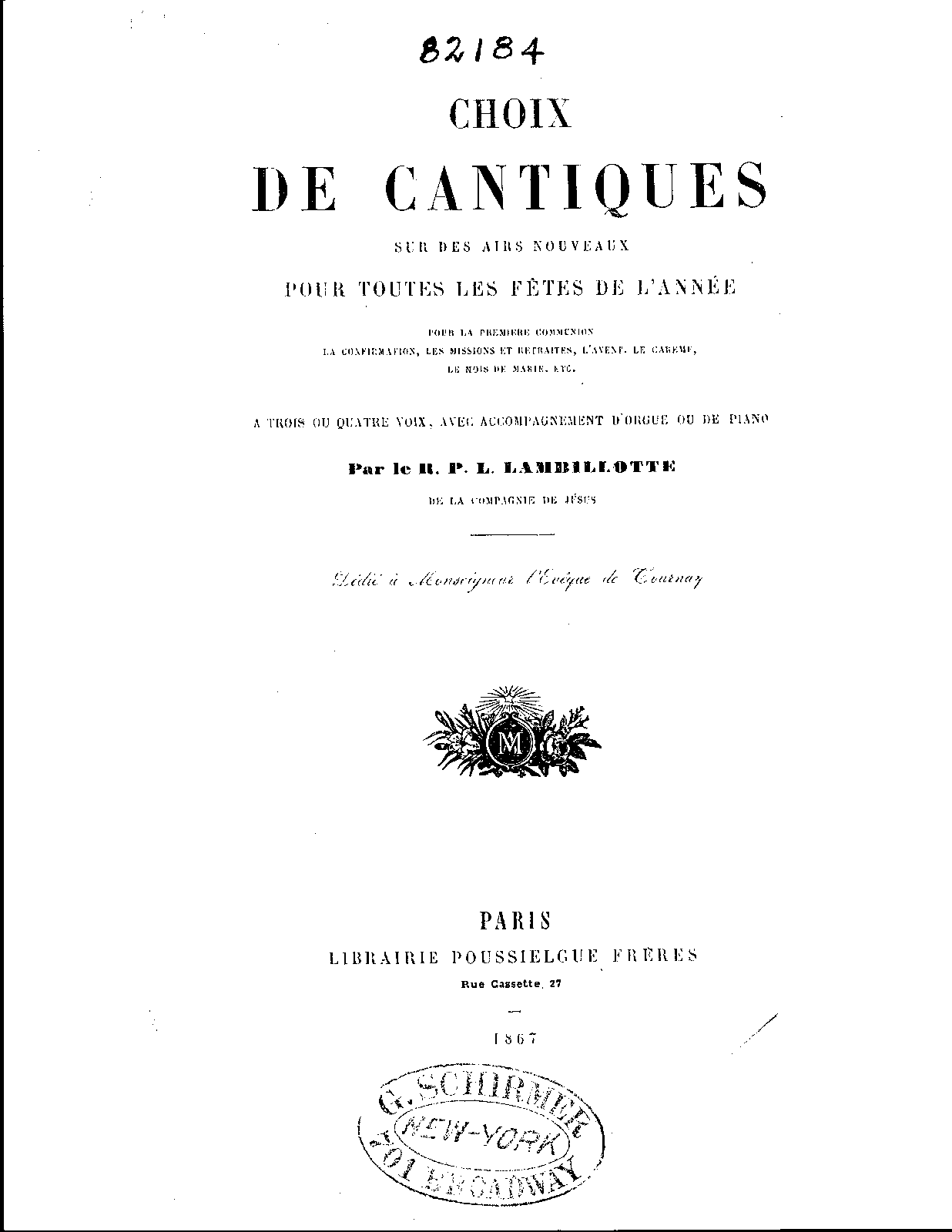 Choix de cantiques sur des airs nouveaux pour toutes les fêtes de l'année ... à trois ou quatre voix avec accompagnement d'orgue ou de piano par le R. P. L. Lambillotte