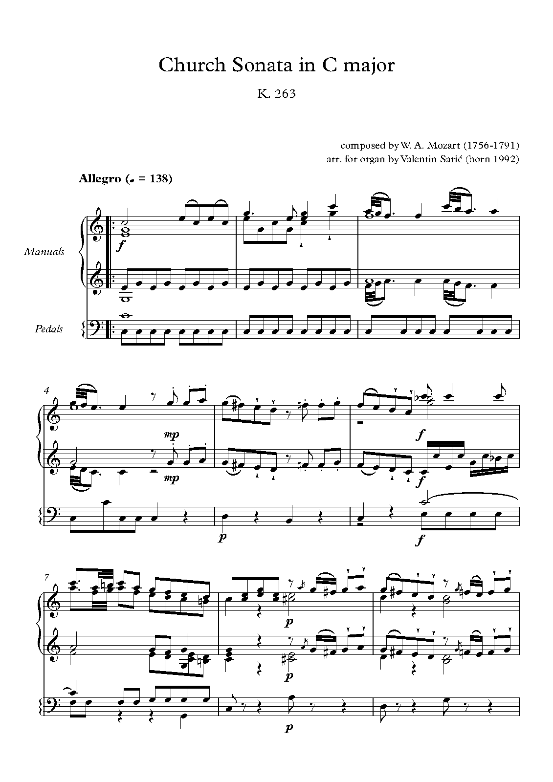 | External Links | NMA score NMA report (German) Wikipedia article (in Spanish) Church Sonata in C major, K.263 - Scores at Sheet Music Plus |